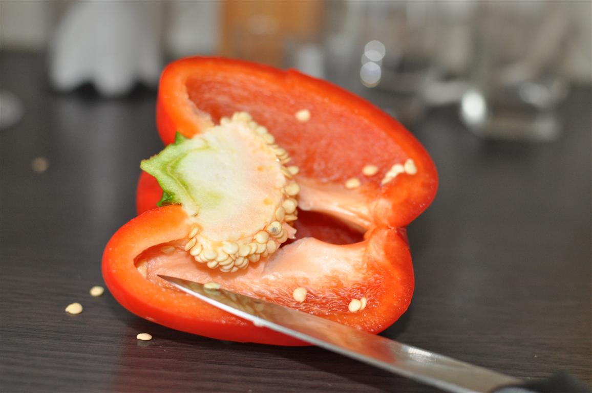 - Kamēr vārās rīsi (20 min.), nomazgājam papriku. Katru pārgiežam uz pusēm. Izgriežam zaļo kātiņu, iztīram sēkliņas un izgriežam baltās daļas. Visvieglāk to ir izdarīt ar nelielu nazīti.