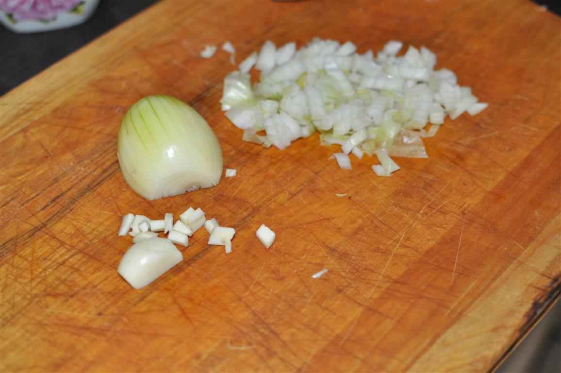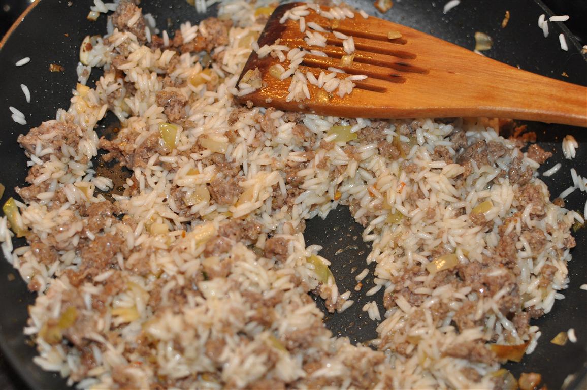 - Liekam vārīties rīsus. Paralēli uz pannas liekam malto gaļu, kurai pievinojam garšvielas, sāli, sasmalcinātus ķiplokus un sīpolus. Apcepam, līdz gaļa vairs nav sarkana. Es iesaku to neapcept brūnu, jo citādi rezultāts vairs nebūs sulīgs.