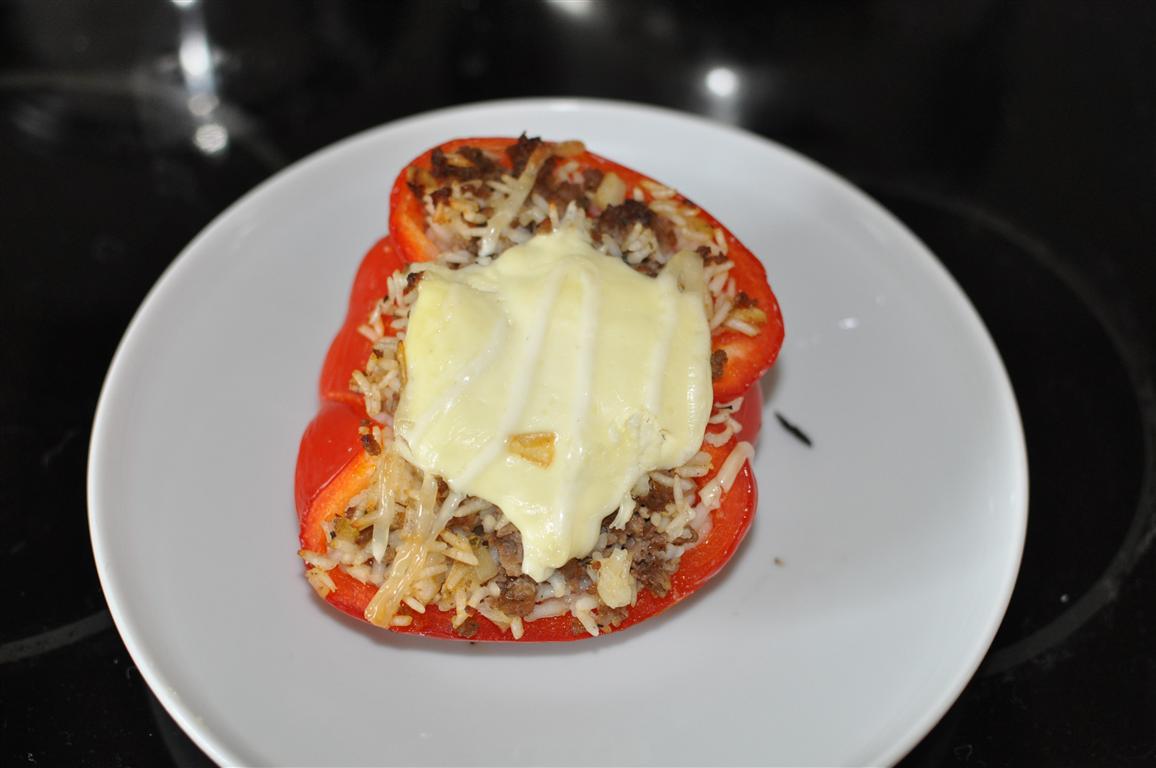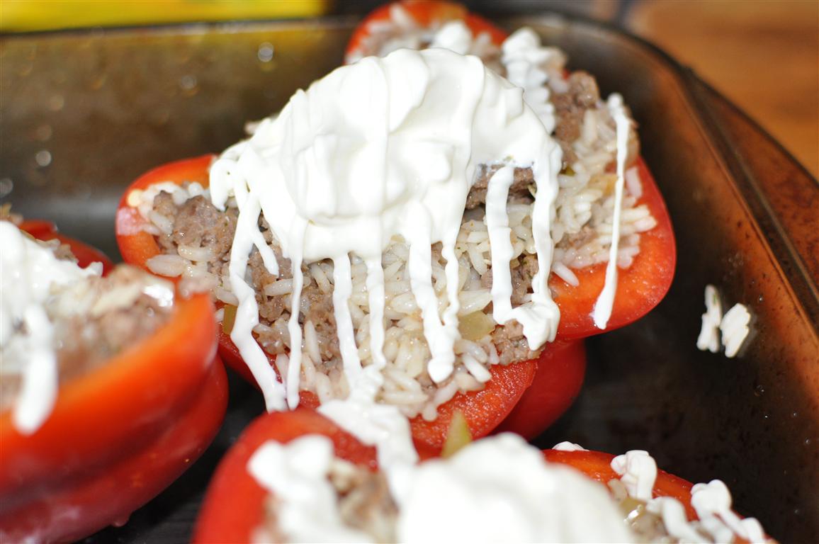 - Tad visu pildam iztīrītajās papriku pusītēs. Kārtīgi sablīvējam. Tad meklējam karstumizturīgu trauku, kurā sarindojam pildītās paprikas. Tām pa virsu liekam krējuma cepurīti- apmēram 1 ēdamkaroti. Un garnējam ar majonēzi.