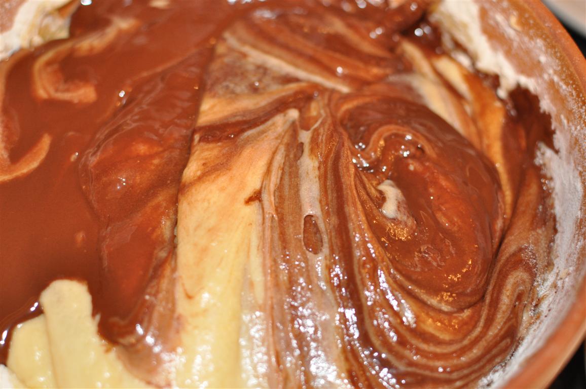 Izkausēto šokolādi pamazām pievieno mīklas masai. Maisa.
