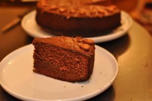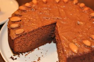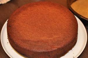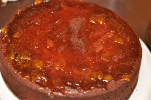 Izgāšam to otrādi. Kamēr vēl karsta, sasildam aprikožu ievārījumu. Tad to pārziežam kūkai. Tas ātri iesūksies un padarīs kūku vēl aromātiskāku. Atdzesē kūku.