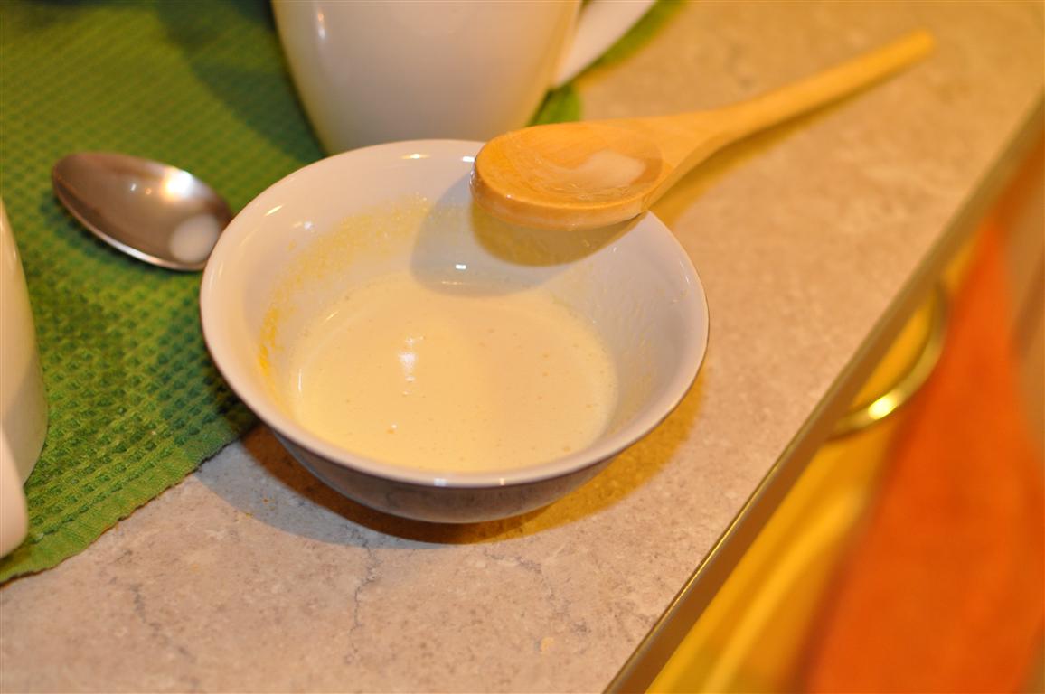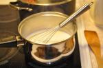 Dzeltenumiem pievieno 6-7 ēdamkarotes siltā piena. Tad šo olu-piena maisījumu pievieno pārējam siltajam pienam, nepārtraukti maisot. Vēlreiz liek uzsildīt mērci, nepārtraukti maisot, kamēr mērce sabiezē.