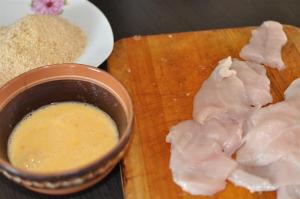 Tālāk varam atstāt tik pat lielus gabalus, es tos dalīju uz pusēm. taču ja taisam nagetus, vistas fileju sagriežam 3×3 cm lielos kubiņos.Samalcinam rīvmaizi. Pievienojam universālo virtuves garšvielu, kārtīgi izmaisam. Sāls Nav jāpievieno.Sakuļam olas, uz katru olu pielejam klāt ēdamkaroti ūdens. Sagatavojam visu cepšanai. Iesaku uz šķīvīša, kur pēc cepšanas liksiet vistas gabaliņus, uzklāt papīra dvielīti, lai tas sasūktu liekās taukvielas.Kad panna un eļļa sakarsušas, katru vistas gabaliņu iemērcam olā, tad rīvmaizē. Varam to atkārtot vēlreiz. Liekam cepties, līdz vistiņa kļuvusi zeltaini brūna. Tās viducītis būs  mīksts un sulīgs.Vistu varam pasniegt ar vārītiem dāzeņiem vai svaigiem salātiem. Labu apetīti!