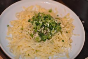 Sieru sarīvē un sajauc ar sasmalcinātiem zaļumiem.