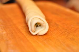 Sarullējam mīklu gara desiņā. Sagriežam mazās ripiņas, kuras nedaudz saplacina un liek uz pannas.