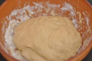Piena un rauga masu pievienojam miltiem un olām. Visu rūpīgi sajaucam, veidojot mīklu. Pievienojam sviestu, kuram jābūt istabas temperatūrā. Sākam mīcīt mīklu, līdz tā vairs nelīp pie rokām. Tā būs vijīga, un maiga. Salīdzinoši ” šķidra”.