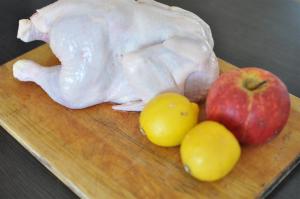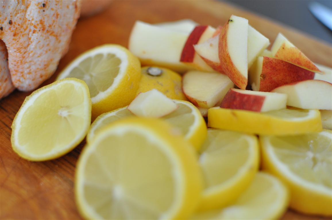 Cāli no visām pusēm ieziežam ar garšvielām un sāli. Rūpīgi iemasējam ādiņā. Sagriežam ābolus palielos gabalos, bet citronus šķēlēs vai daivās.