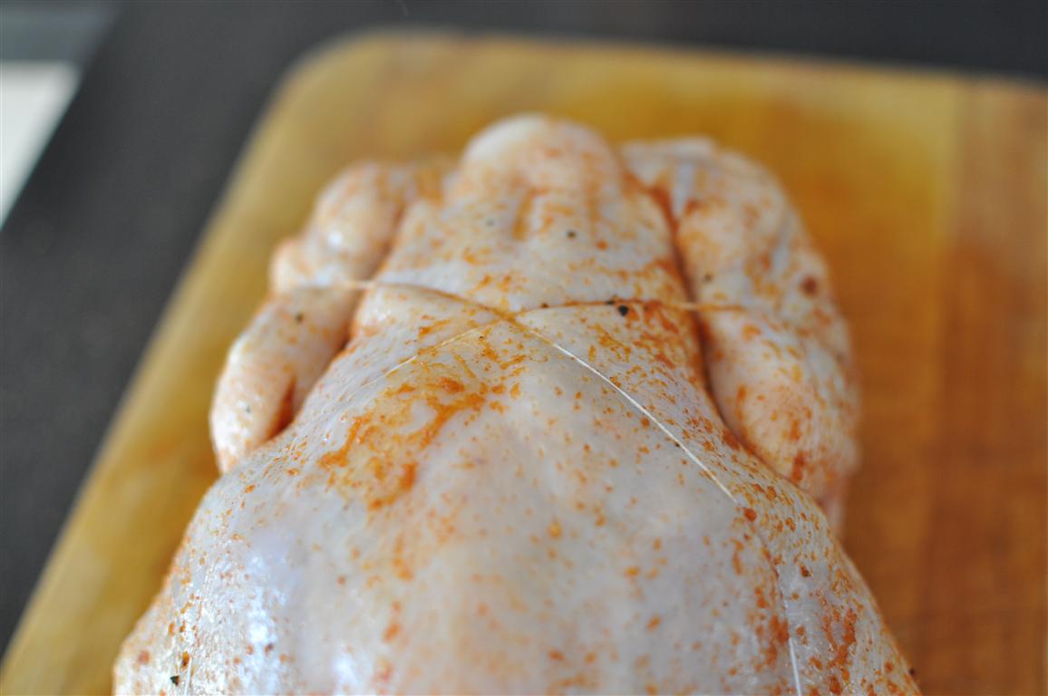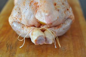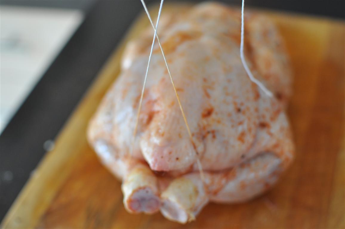 Pēc tam iesaku cāli jeb vistu sasiet. Tā cepot gala rezultāts būs daudz labāks- spārniņi neapdegs un fileja būs sulīga un maiga. Nogriežam apmēram 1- 1,5 metru garu striķīti vai izturīgu kokvilnas diegu. Cāli noliekam uz vēderiņa. Rajonā zem spērniem novietojam diega vidusdaļu, un visrpusē diegu sakrustojam, tādā veidā cieši. piespiežot spārniņus.