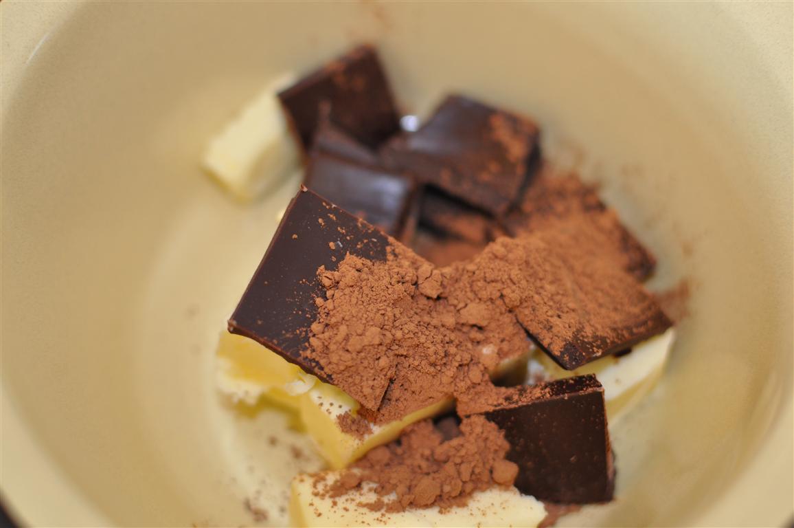 Tālāk gatavo šokolādes masu. Ūdens peldē izkausē sviestu, šokolādi un kakao.