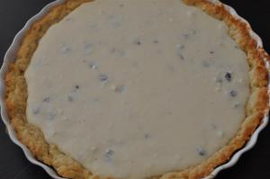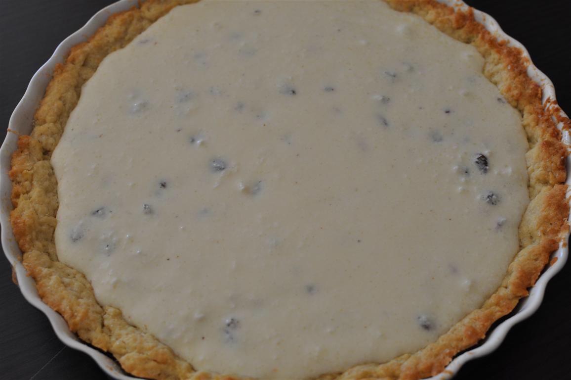 Tad nu atliek visu savienot vienā ēdienā. Biezpiena masā iejaucam rozīnes un pildam izceptajā smilšu mīklas pamatnē.