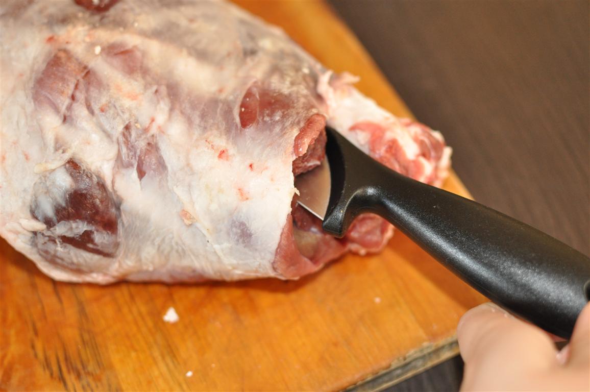 Ar garu, asu nazi veic iegriezumu gar kājas centrālo kaulu. Nelielākus, dziļākus iegriezumus līdz kaulam izdara arī pārējā kājā. Tajos rūpīgi pilda ar rozmarīna, ķiploku un sāls maisījumu. Tad arī kājas ārpusi rūpīgi iemasē ar šo maisījumu.
