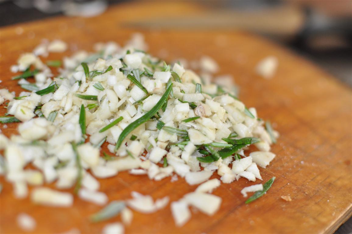 Smalki sakapā ķiplokus, no rozmarīna kātiņa notrauc lapiņas un sakapā kopā ar ķiploku un sāli (apmēram 2-3 ēdamkarotes, atkarībā no kājas izmēriem).