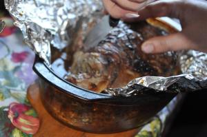 Ugunsdrošā traukā liekam cepamo folliju, tajā liekam kāju un rūpīgi ietinam. Cepšana- uz katriem 450 gramiem gaļas (bez kaula) jārēķina 20 minūtes cepšanas laika 200- 220 grādu temperatūrā plus 20 minūtes, kuras ļaujam gaļai atpūsties. Es savu cepeti cepu attiecīgi stundu un pēdējās desmit minūtes noņēmu folliju, krāsnī ieslēdzu grilla režīmu. Ja jūsu krāsnij tāda nav, iesaku, folliju noņemt 20 minūtes pirms cepšanas laika beigām. Kad gaļa izcepta, to atstāj atpūsties mērenā siltumā. Pasniedz griežot šķēlēs.