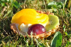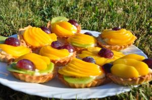 Greznošanai pēc izvēles- kārba konservētas aprikožu pusītes, kivi, zemenes, vīnogas, konservēti mandarīni vai citi augļi.Pagatavojam mīklu groziņiem- sviestam jābūt mīkstam, tad to kopā ar pārējām sastāvdaļām to sajuc bļodā. Es to daru ar rokām, taču var izmantot arī virtuves kombainu. Mīkla rūpīgi viendabīgi sajaukta, ir jāsaveļ bumbā, kuru uz pusstundu noliek ledusskapī. Tikmēr pagatavojam olu krēmu. Katliņā ielej pienu, piesit olu dzeltenumus un cukuru. Maisot pieber miltus. Rūpīgi izmaisa, tad liek uz plīts un mazā siltumā karsē, nepārtraukti maisot. Pāris minūšu laikā krēms būs sabiezējis, noņemam no uguns un atdzesējam.Tad mīklu plānā kārtiņā liekam metāla formiņās. Mīklas daudzumam vajadzētu pietikt 12 kēksiņu formiņām, kuras ir 8 cm diametrā. Cepam 200 grādos apmēram 10-15 minūtes, kamēr groziņi ir gaiši brūni.Tad tos pildam ar pagatavoto krēmu. Pa virsu kārtojam augļus pēc izvēles. Piemēram, konservētas persiku pusītes sagriežam smalkās šķēlītēs, uz pusēm pārgriestas vīnogas, kivi šķēlītes vai pat veselas zemenes.Ja groziņi paredzēti ilgākai uzglabāšanai, tad ieteiktu tos pārklāt ar veikalos nopērkamu želeju, kas speciāli paredzēta kūku garnēšanai. Tādejādi groziņi būs kā svaigi arī nākamajā dienā!
