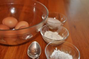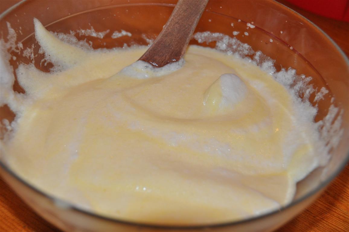 Lai biskvīts  sanāktu ideāls, olas jāizņem no ledusskapja vismaz pusstundu pirms kūkas pagatavošanas. Jo tad putojot olas baltumu, tas iegūs vislielāko apjomu. Tātad pirmais darbs- atdalīt vienā traukā olu baltumus no dzeltenumiem. Olu baltumiem izvēlies lielāku bļodu. Kad tas izdarīts, dzeltenumiem pievieno cukuru, rūpīgi maisi (bet nekul) apmēram 4-5 minūtes, lai pakūst cukurs. Tad olu masai pievieno strīķētas 5 ēdamkarotes miltus un strīķētas 5 ēdamkarotes kartupeļu cieti.