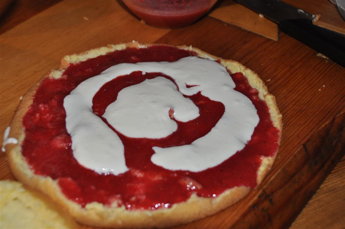 Pusi no zemenēm notīram, un uz pusēm sagriežam, un tad saspaidam ar dakšiņu. Tā lai veidojas mercīte ar jūtamiem zemeņu gabaliņiem. Uzputojam saldo krējumu- lejam traukā, pievienojam cukuru un putojam. Kad biskvīts atdzisis to uzmanīgi ar nazi pārgriež uz pusēm, lai sanāktu divas biskvīta kārtas. Uz vienas klājam zemeņu masu un putukrējumu. Visrū liekam otru kārtu. Arī to pārklājam ar putukrējumu un šķēlēs sagriestām atlikušajām ogām. Lai garšo!