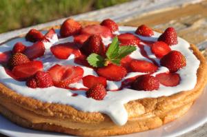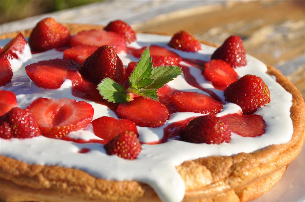 Šāda biskvītkūka manās mājās ir kā likums jācep vismaz divas reizes gadā. Vienreiz-zemeņu sezonā, bet otro pagatavoju ar avenēm. Jo kūkas pamatā ir biskvīts, kuru varam papildināt ar visdažādākajiem augļiem un krēmiem. Šī kūka ir ļoti maiga, gaisīga, ideāli piemērota vasarīgai ballītei, jo ir ātri pagatavojama. Vēl to var pasniegt ar vaniļas mērci, plombīra sadējumu. Sastāvdaļas biskvītam: