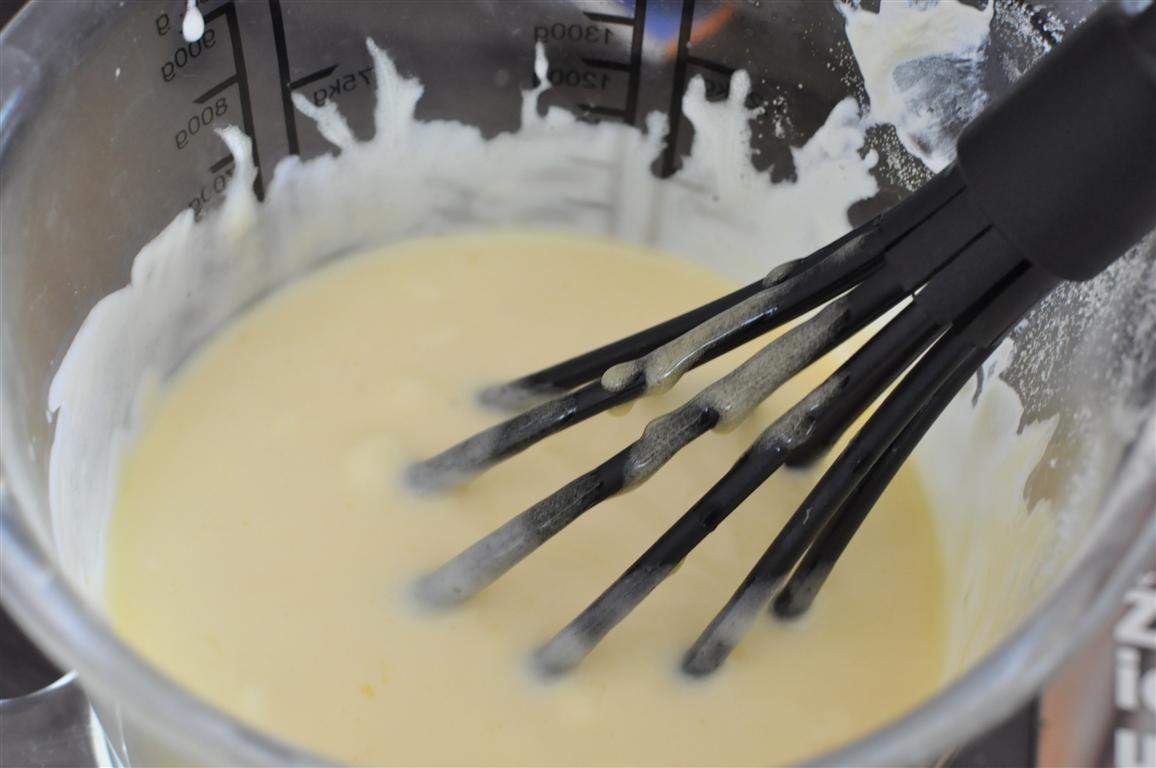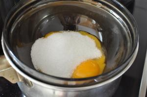 Olu dzeltenumiem pievieno apmēram 100g cukura, samaisa un liek karsēties ūdens peldē. Es esmu atradusi kaliņu un bļodiņu, kuri ideāli sader kopā, jo bļodas mala ir nedaudz platāka kā katliņš- katliņā ielej karstu ūdeni, tā lai tas neaizskartu bļodiņas dibenu. Sāk sildīt, nepārtraukti maisa. Šī procedūra jāveic apmēram 5 minūtes.