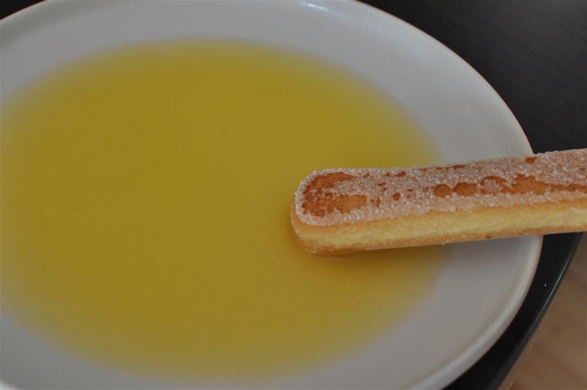 Sagatavojam trauku kurā kārtosim tiramisu. Šķīvītī vai lēzenā bļodiņā ielejam apelsīnu mērci, ņemam biskvīta cepumus un uz pāris sekundēm iegremdējam sulā. Tas tiešām jādara sekundes 2 vai 3 ne ilgāk, citādi gaisīgie cepumi izjuks. Kā arī tie sulā jāiegremdē tikai ar vienu sānu-tur kur nav cukura kārtiņas. Tā cepumu pēc cepuma, iegremdētu sulā, liekam trauka apakšā, cieši vienu pie otra. Tā veidojam pirmo kārtu.