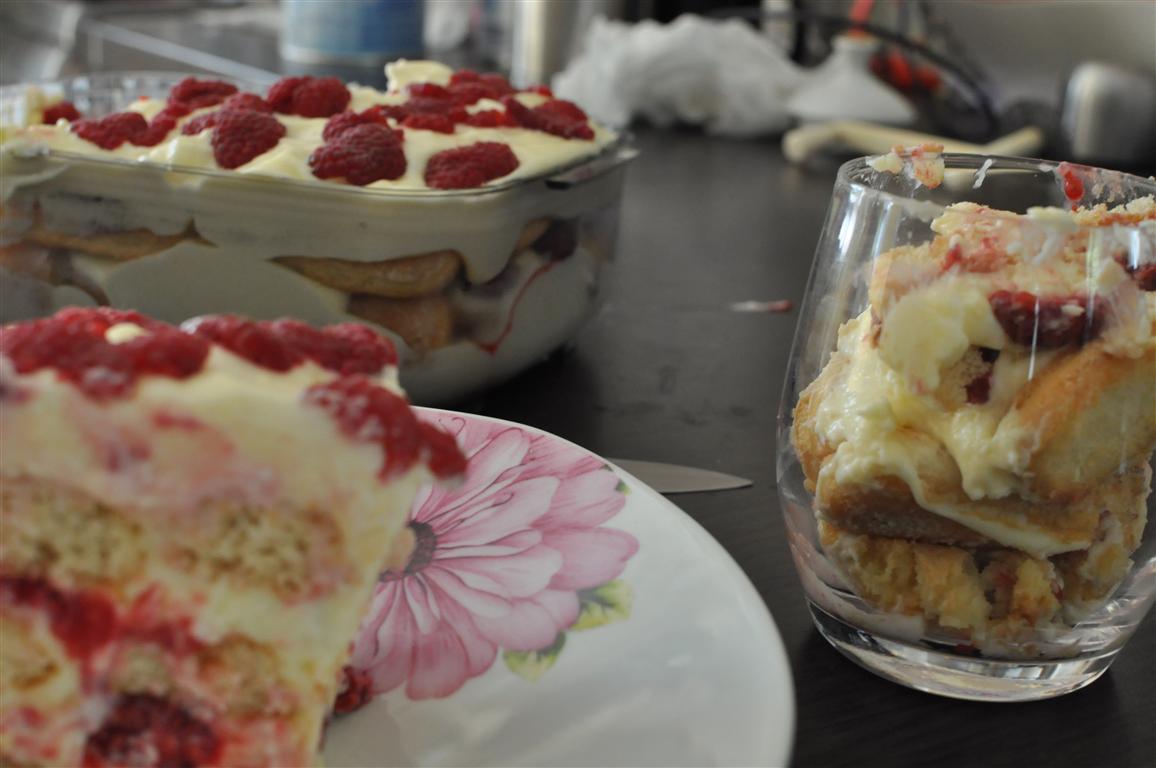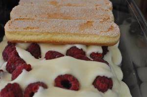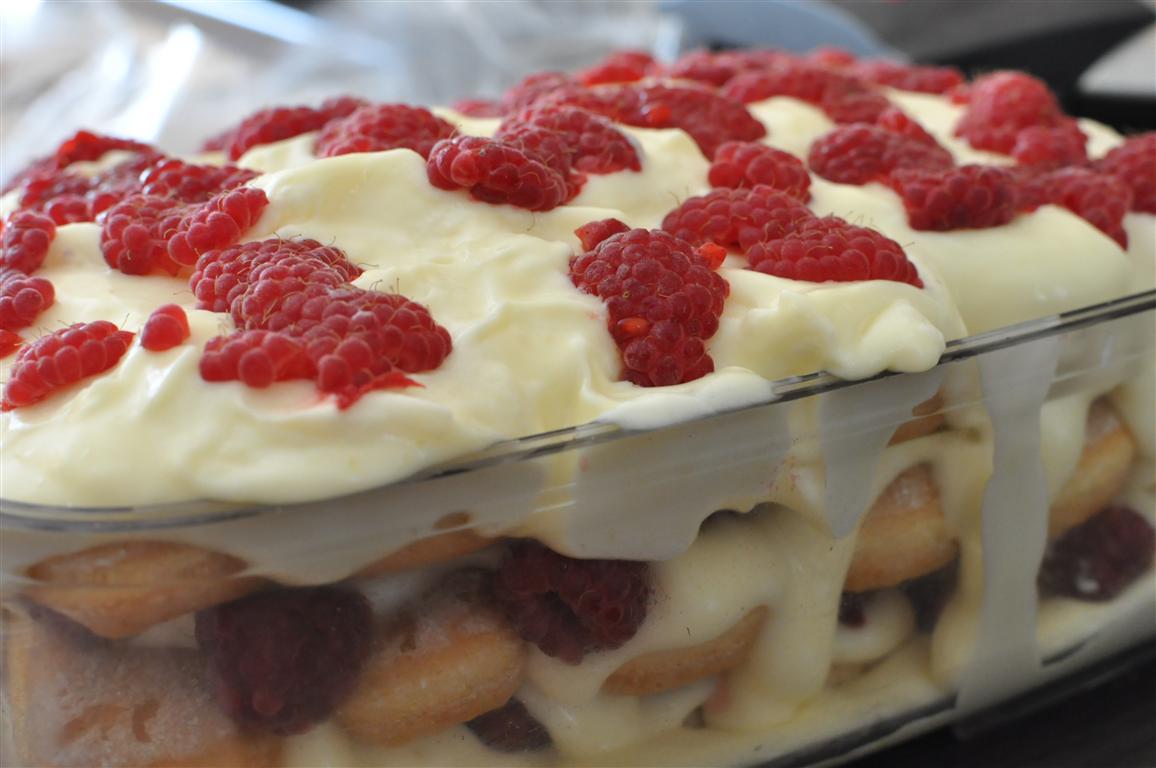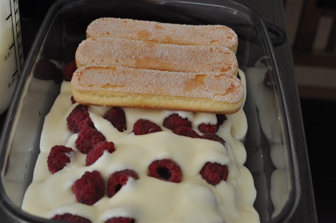 Pa virsu klājam krēmu un pārberam avenes. Tad atkal kārta ar dāmu pirksiņiem.