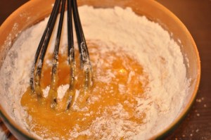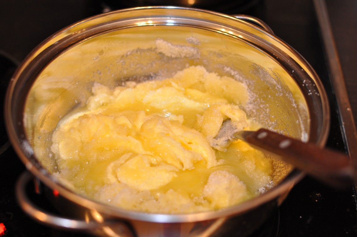 Tad nu ķeramies pie darba. Vispirms katliņā liekam sviestu un cukuru. Visu uz lēnas uguns maisam (5minūtes)līdz cukurs un sviests izkusis. Visu lejam lielā bļodā un pievienojam olas. Visu kārtīgi samaisam.