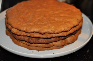 Tad šo pirmo kūkas kārtu liekam cepties 180 grādos, apmēram 8 minūtes. Jā, tik maz. Kūka kārta būs zeltaini brūna un izņemta no formas drīz kļūs cieta un kraukšķiga. Tā cepam kārtu pēc kārtas.