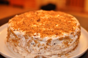 Kad kārtas izceptas, to maliņas aplīdzinam. Man to visvieglāk izdarīt bija, uzliekot katrai kūkas kārtai lēzenu šķīvi un ar nazi nogriežot pāri stāvošās maliņas. Atgriezumi ir jāsadrupina un tos lietosim kūkas greznošanai.