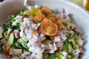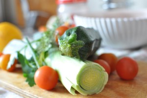 Vispirms nomazgājam un sagriežam dārzeņus nelielos kubiņos. Jaunos cukīnī nav nepieciešams mizot. Sagriežam arī sieru, gaļu un garšaugus.