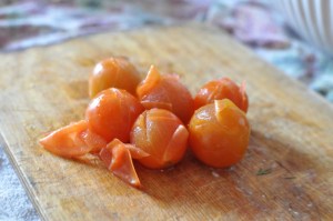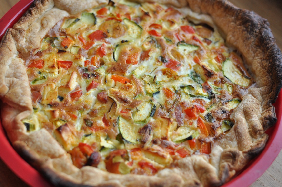 Tomātiem ieteiktu novilkt miziņu. Tas izdarāms pavisam vienkārši. Ilejam katliņā ūdeni, liekam vārīties. Tikmēr tomātam ar nazīti tā augšdaļā izdaram nelielu, krustenisku iegriezumu. Un sagatavojam citu, nelielu trauku ar aukstu ūdeni. Kad ūdens katliņa sācis vārīties, tajā uz 1minūti ieliek tomātu, pēc tam nekavējoties izņemam un ieliekam traukā ar aukstu ūdeni. Tagad miziņa novelkama pavisam viegli. (Kā redzams to iespējams izdarīt arī ķirštomātiņiem)Tad nu viss ir sagriezts, pildījums ir rūpīgi jāsamaisa, lai tā garša būtu viendabīga. To visērtāk izdarīt lielā bļodā. Pēc tam beram pildījumu cepamajā traukā virs tur ieklātās mīklas. Pēc tam bļodā sajaucam olas kopā ar saldo krējumu, sāli un pipariem. Ja garšo, var pievienot arī nedaudz čili pipariņa. Visu rūpīgi sakuļ un pārlej dārzeņiem. Mīklas malas nedaudz apgriež un ieloka uz iekšu. Pīrāgu liekam cepties 40 minūtes 180 grādos.