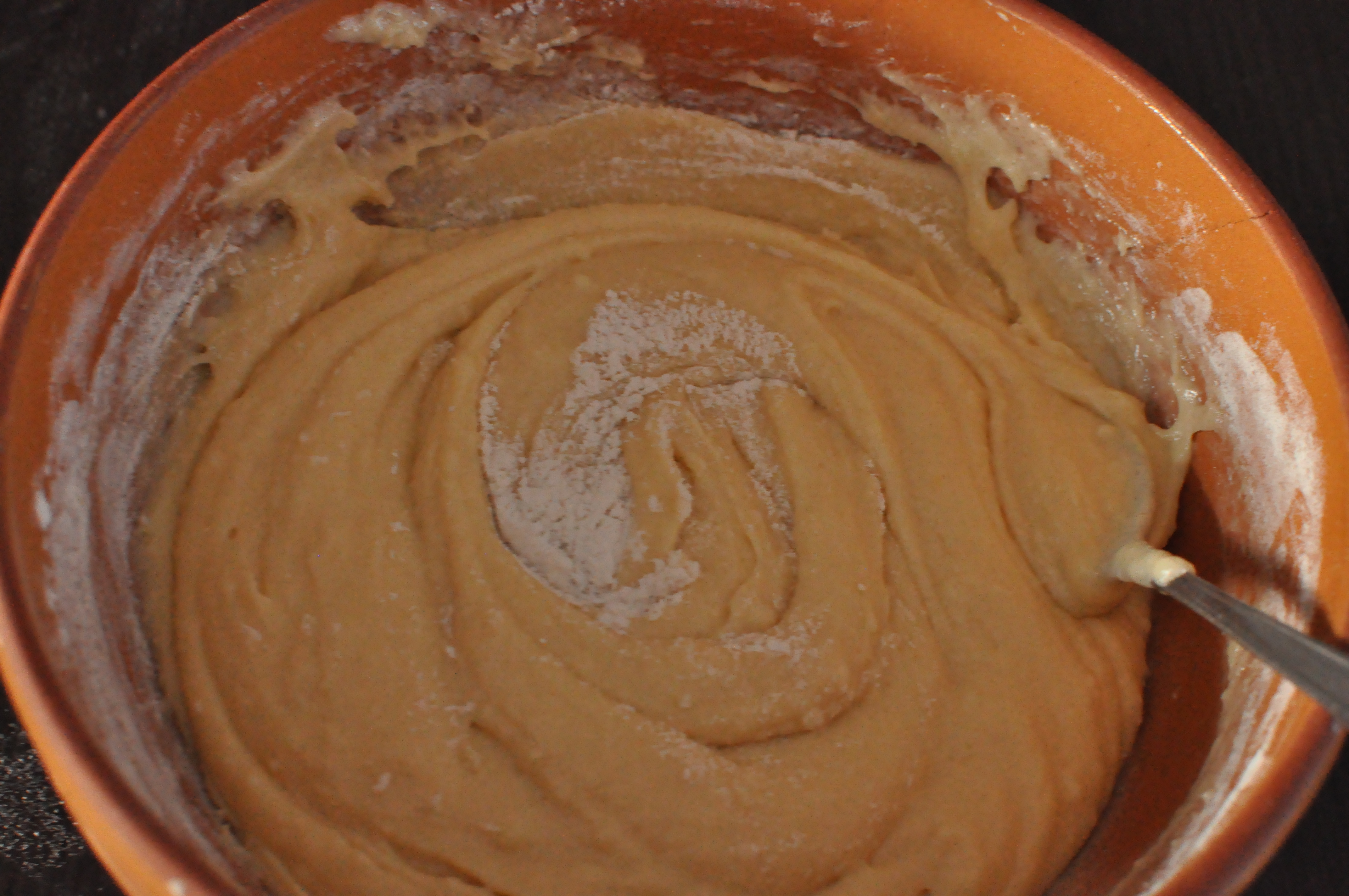 Kausētu sviestu sajaucam ar olām, tad pievieno pienu.