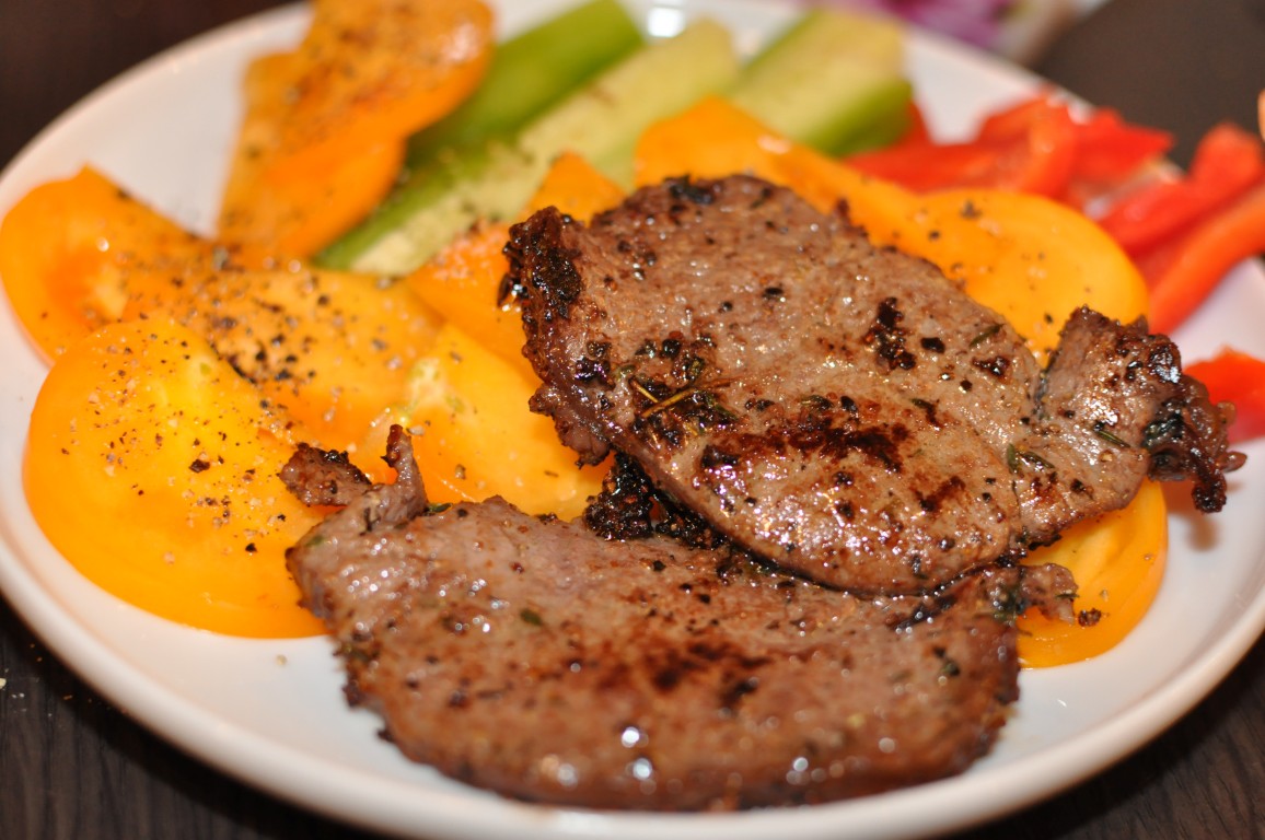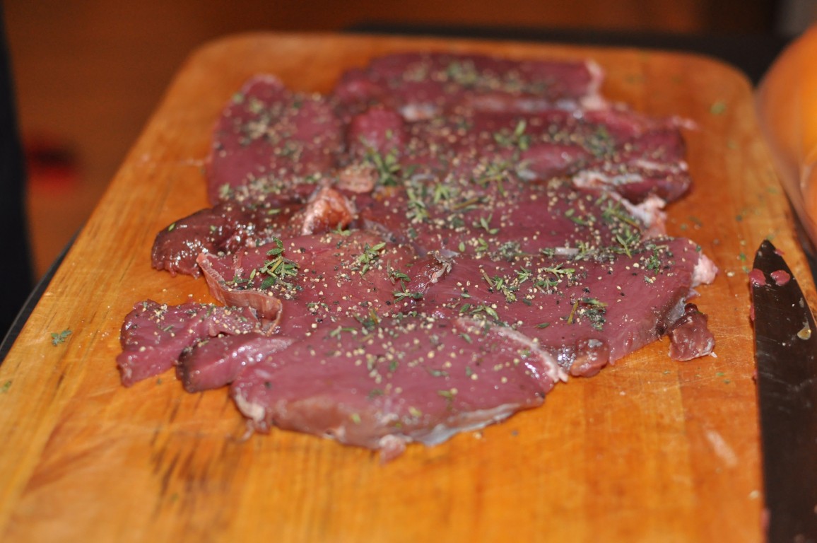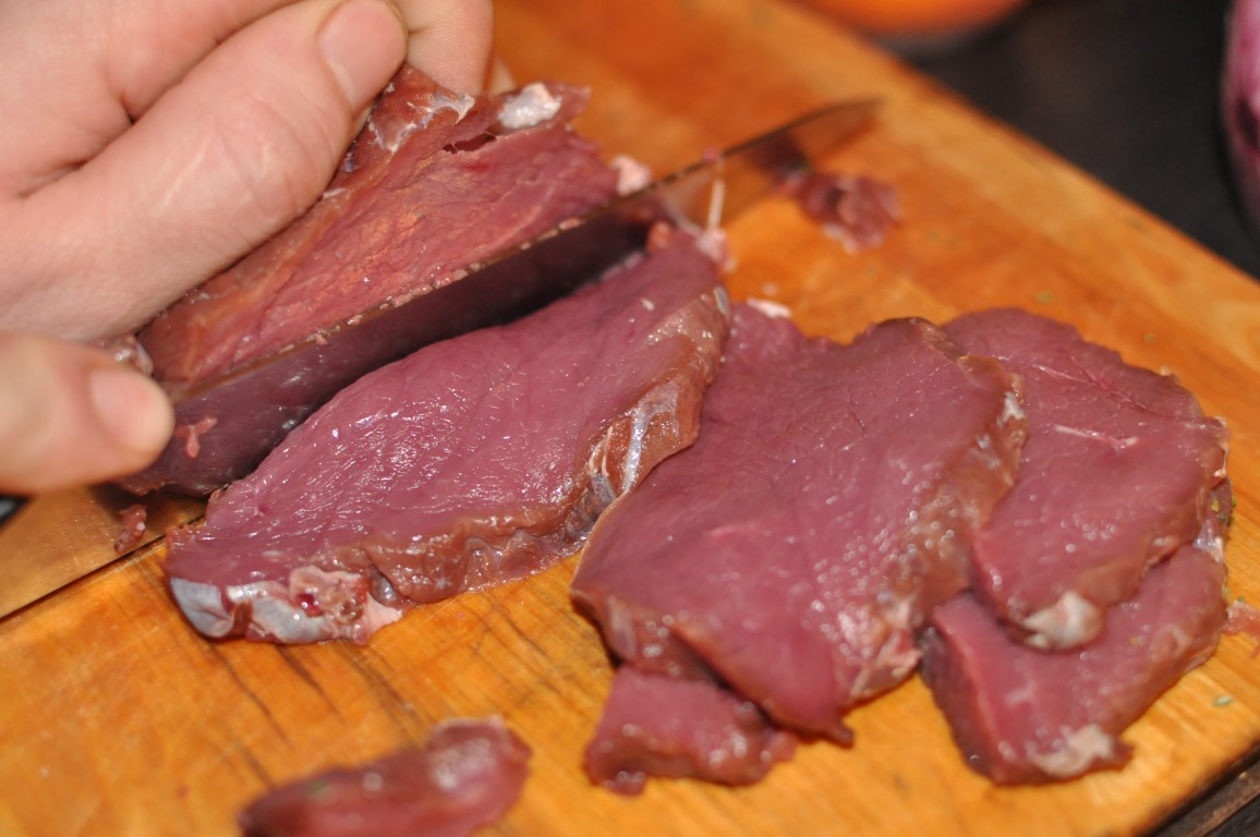 Sagatavojam gaļu- nogriežot cīpslas un plēves, tad nogriežam apmēram puscentimetru biezas gaļas šķēles.