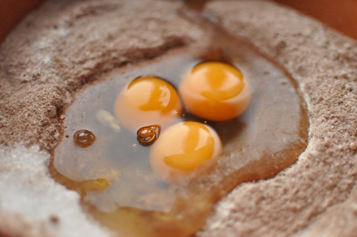 Citā bļodā sajaucam birstošās sastāvdaļas- miltus, kakao, sodu, cepamo pulveri un cukuru. Visu kārtīgi izmaisām.