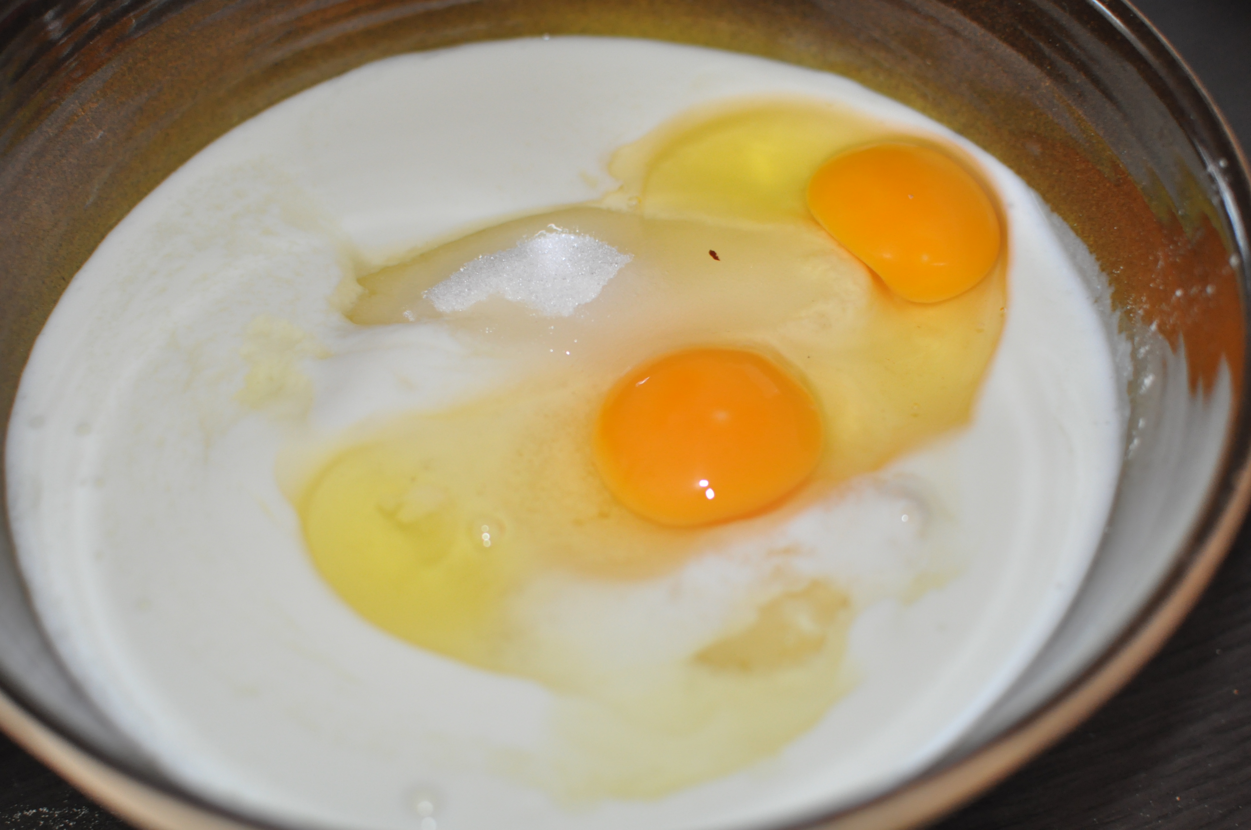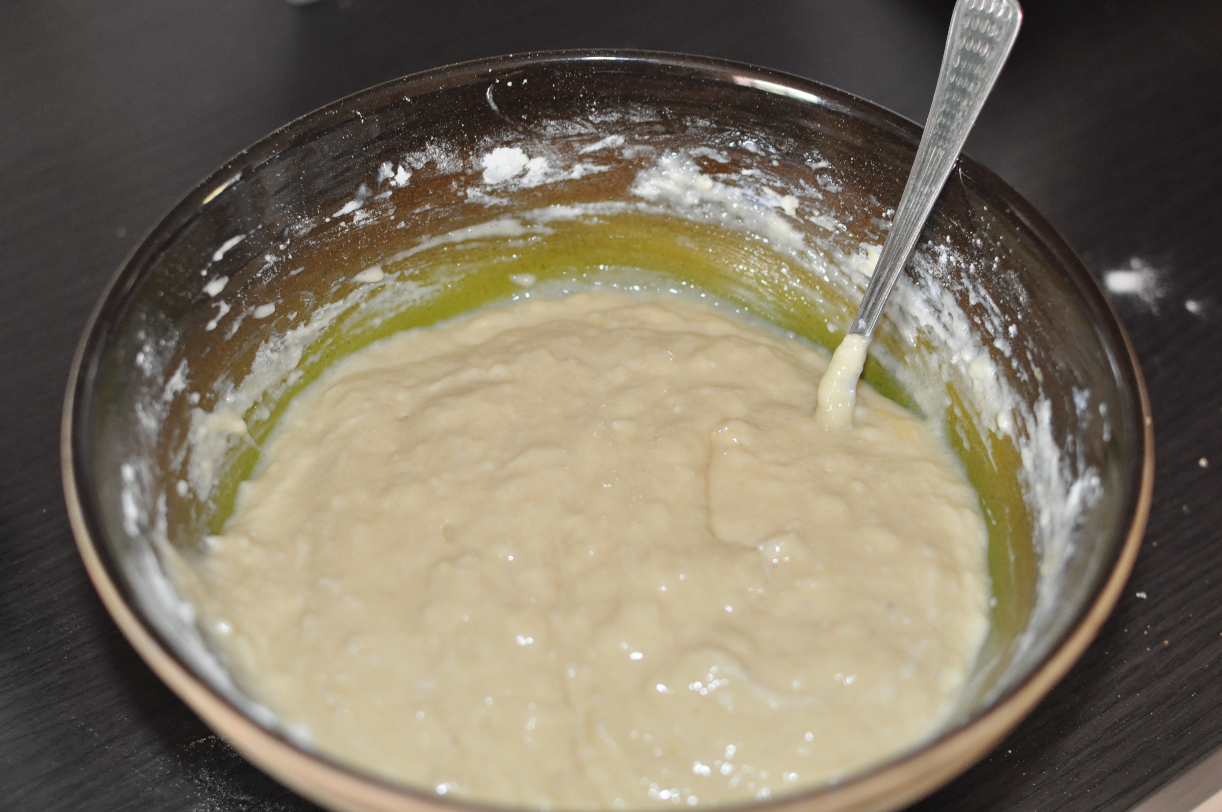No kefīra, miltiem, 2 olām, cepamā pulvera, cukura samaisam mīklu un noliekam uz 20- 30 minūtēm atpūsties. Tā ir salīdzinoši šķidra- atgādina biezo pankūku mīklu. Pannu izklājam ar cepamo papīru.