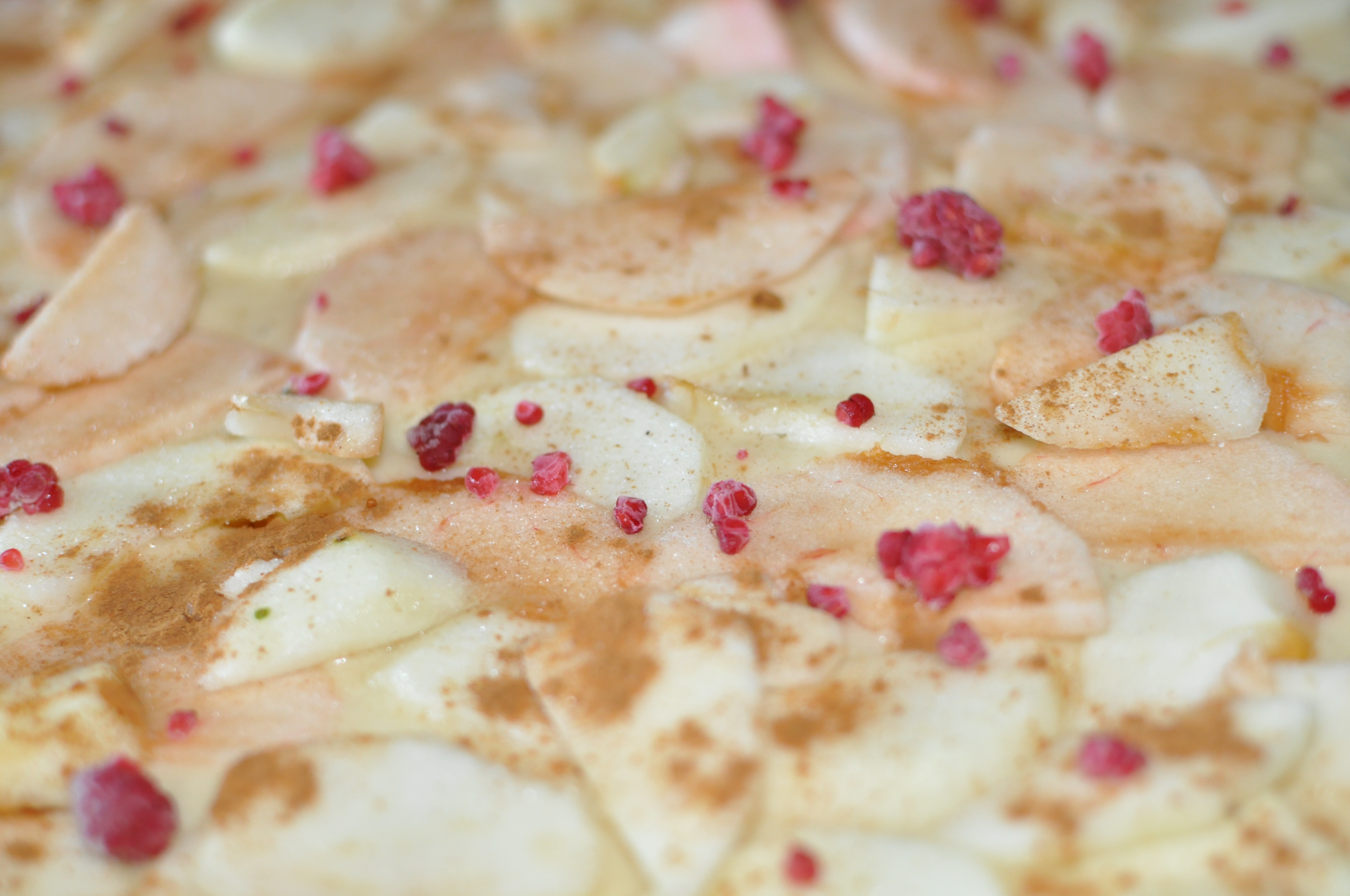Mīklu lejam pannā. Atseviškā trauciņā sakuļam palikušo olu, skābo krējumu un 2 ēdamkarotes cukuru. Pēc tam uz mīklas var kārtot ābolu šķēlītes un visu pārliet ar pagatavoto olu- krējuma masu. Es krāsas akcentam pievienoju arī dažas odziņas no saldētavas- šoreiz meža avenītes un kanēli.