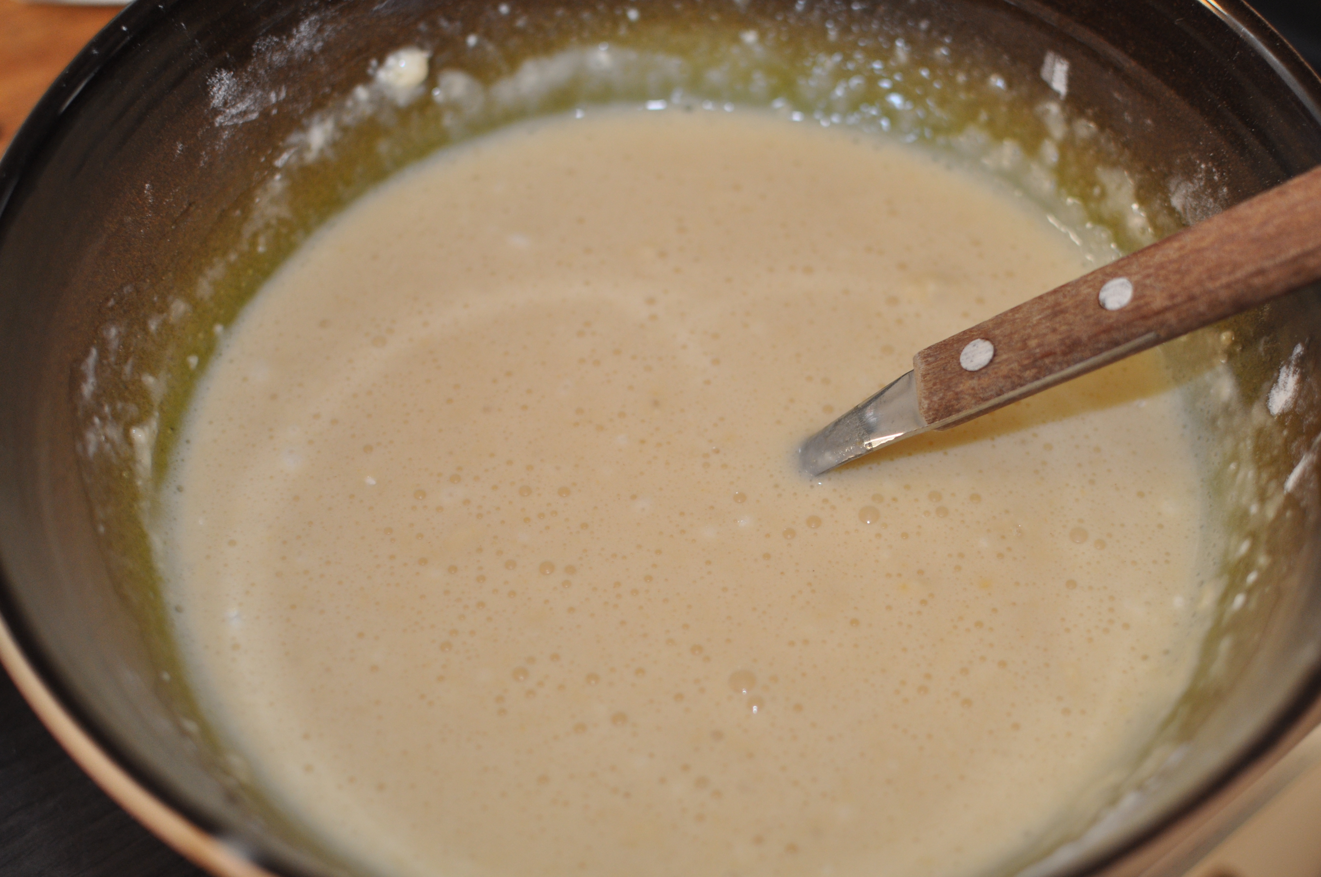 No miltiem, olām, cukura, saldā krējuma un cepamā pulvera pagatavojam mīklu. Tā pēc biezuma atgādinās biezo pankūku mīklu. Pannā ieklājam cepamo papīru (obligāti), mīklu izlīdzina un cepj 10 minūtes 175 grādu temperatūrā.