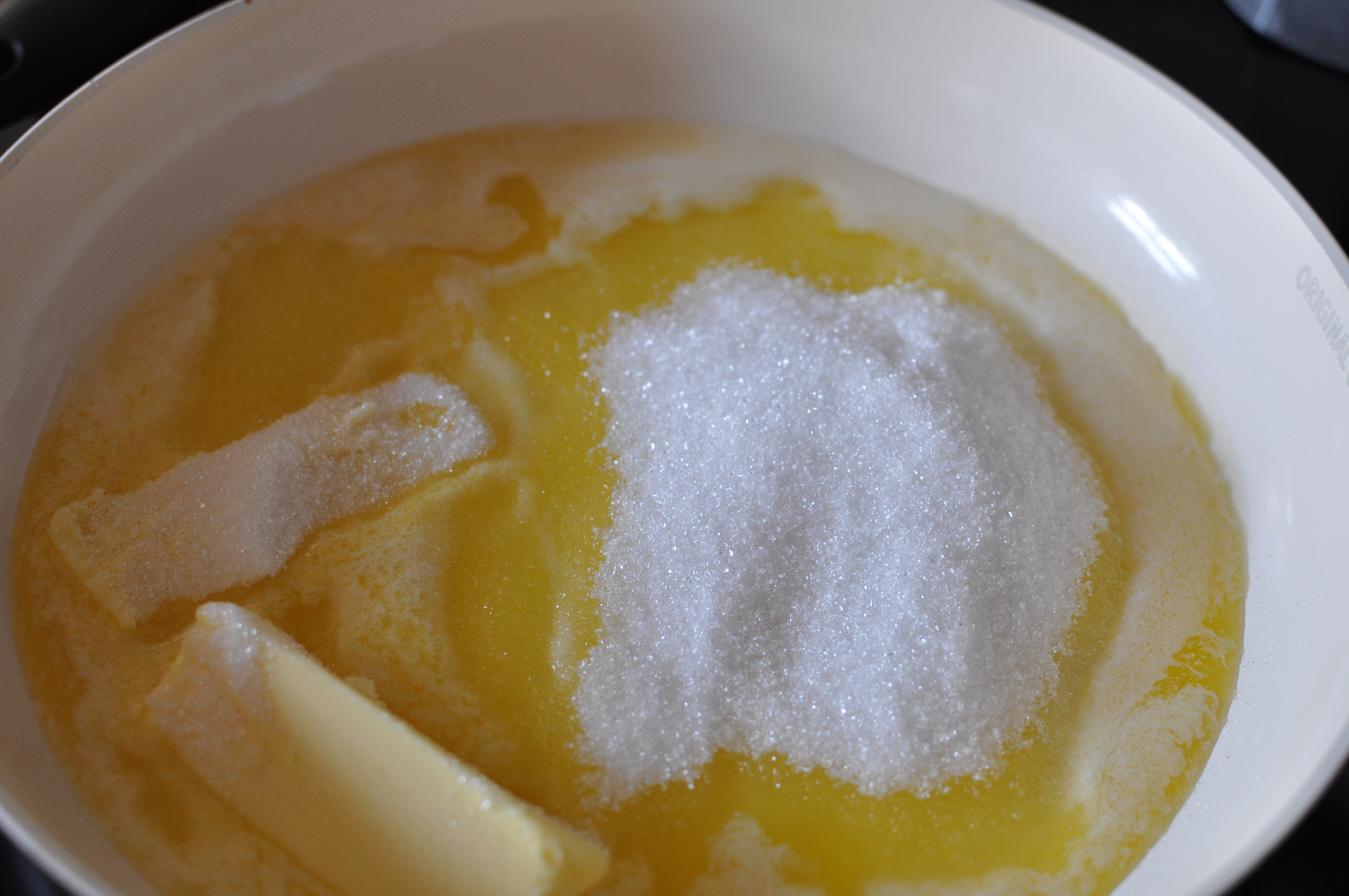 Tikmēr pannā izkausē sviestu un cukuru, pievieno pienu aktīvi maisot. Tad pievieno un nedaudz apcep arī mandeļu skaidiņas.