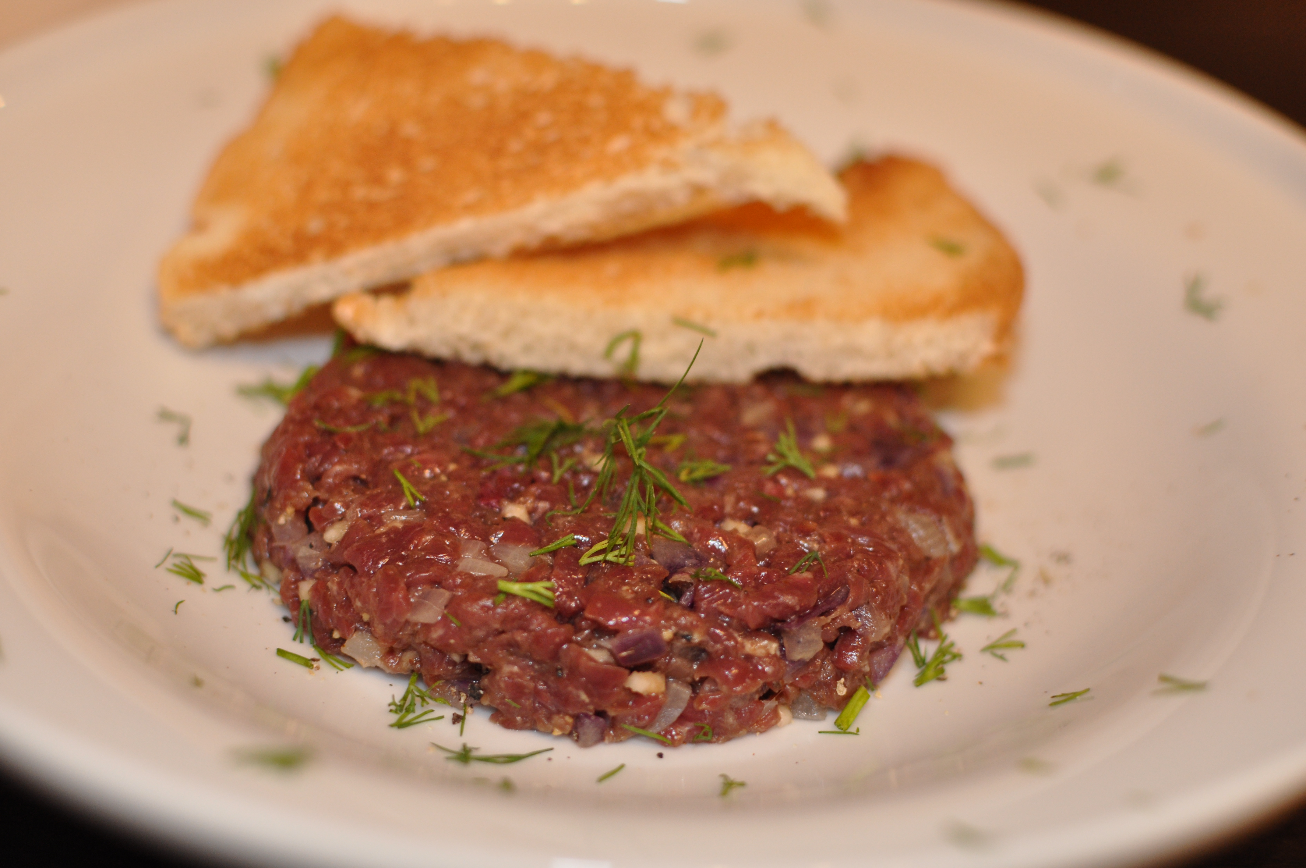 DSC_5809Sagatavojam brieža gaļas fileju- notīrot pilnīgi visas plēves vai cīpslas. Gaļu sagriež un sakapā. Smalki sagriež sīpolu un apcep nelielā sviesta daudzumā līdz tie kļuvuši caurspīdīgi, tad atdzesē. Ķiploku smalki sakapā. DSC_5816Visu sajaucam kopā- konjaku, piparus sāli, tad sīpolus un ķiplokus, iemaisa sinepes, nedaudz kapātas dilles. Formē metāla gredzenā un ļauj vismaz 2 stundas atdzist un savilkties garšām. Pasniedz ar grauzdētu baltamaizi, paipalu oliņu (pēc vēlmēm) un kapātām dillītēm.