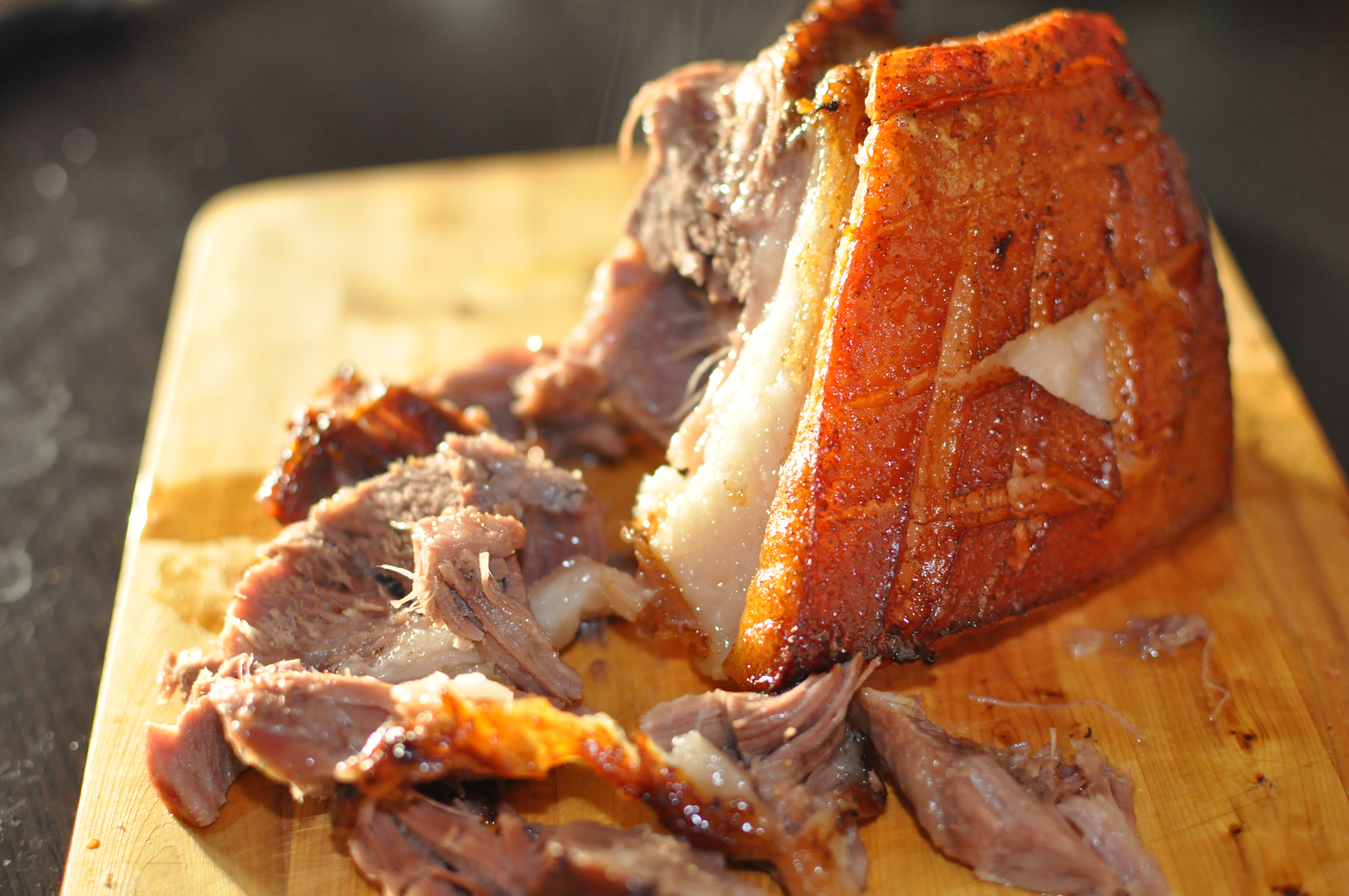 Gaļas ādiņas daļu viegli ar naža galu iegriež tā, lai vedotos restīte. Tad gaļu rūpīgi ierīvē ar sāli, neaizmirstot ādu. Tad gaļu ierīvē ar sinepēm-aptuveni divām tējkarotēm. Visu apkaisa ar pipariem. Sakarsē pannnu un gaļu no visām pusēm ātri apbrūnina, tad pārceļ uz cepamo trauku, kur ievietoti dārzeņi.