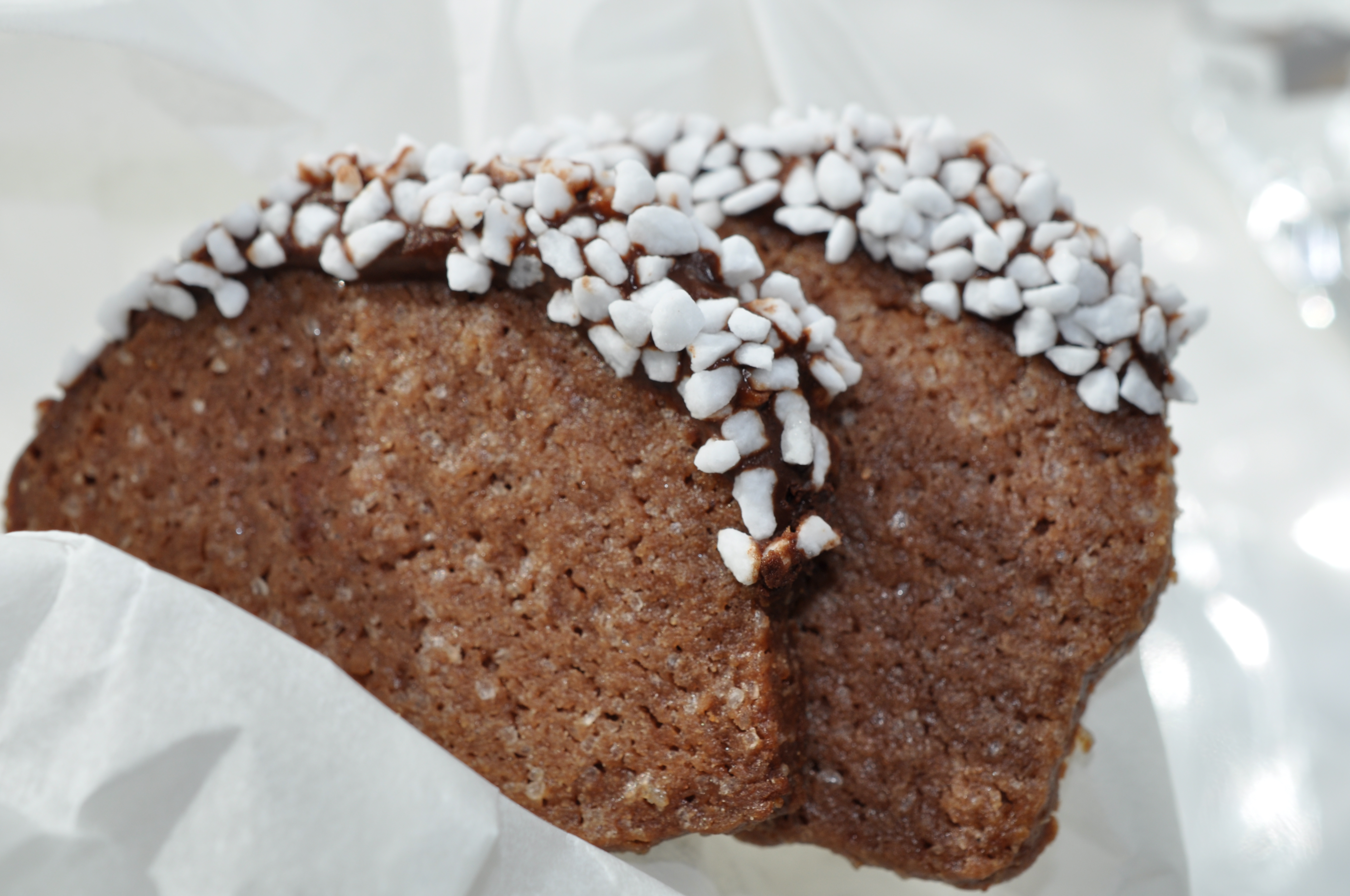 Rotājumi: katliņā virs karsta ūdens kausē šokolādi ar sviestu. Atdzisušus cepumus iemērc šokolādē, pēc tam cukura pērlītēs. Ļauj sastingt.