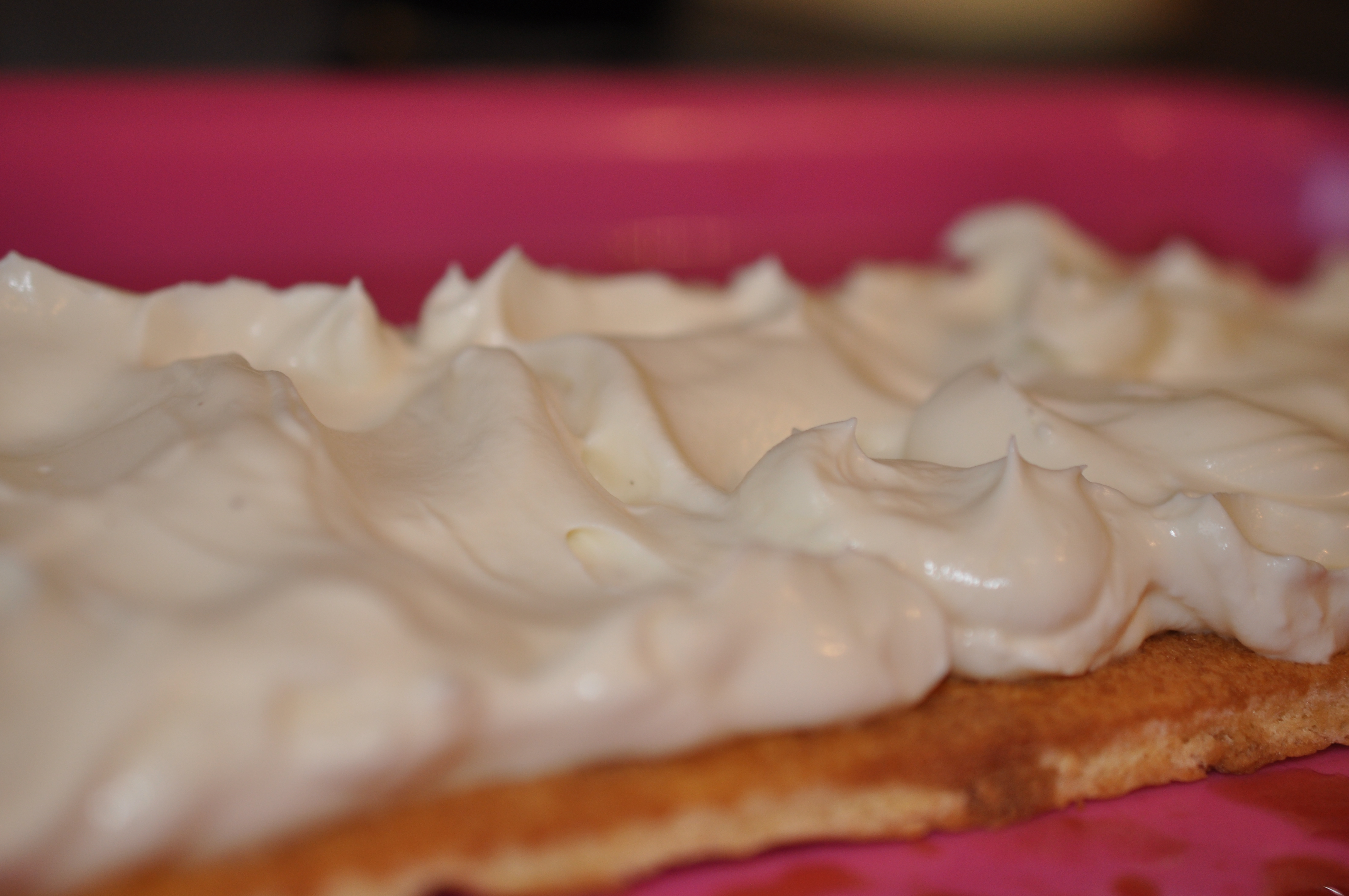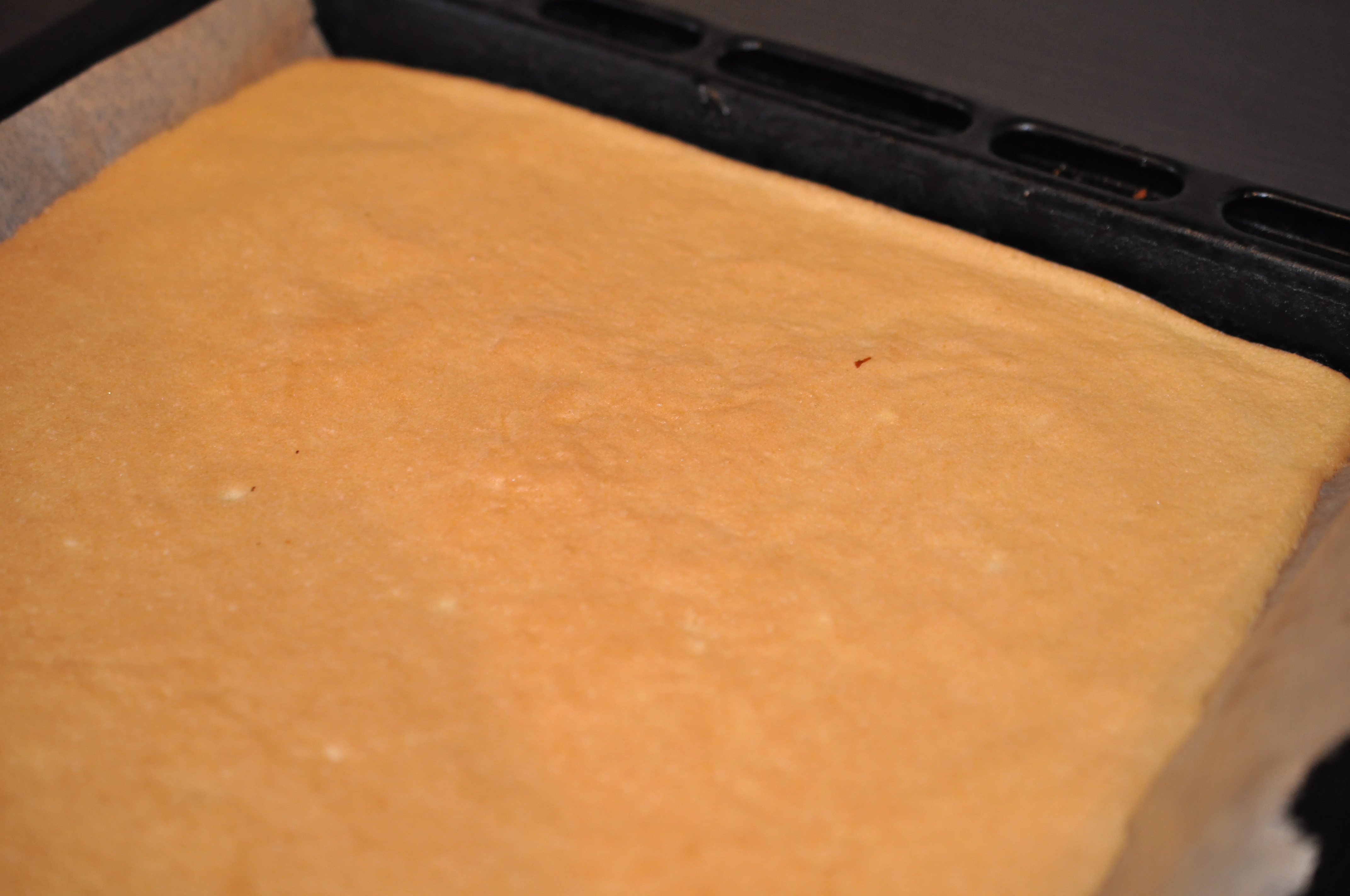 Masu izklāj uz cepamās pannas, kurai uzklāts cepamais papīrs. Sanāk ļoti plāna biskvīta kārta, bet tas ir tieši tas, kas vajadzīgs. Cepam 180 grādos 10 minūtes.