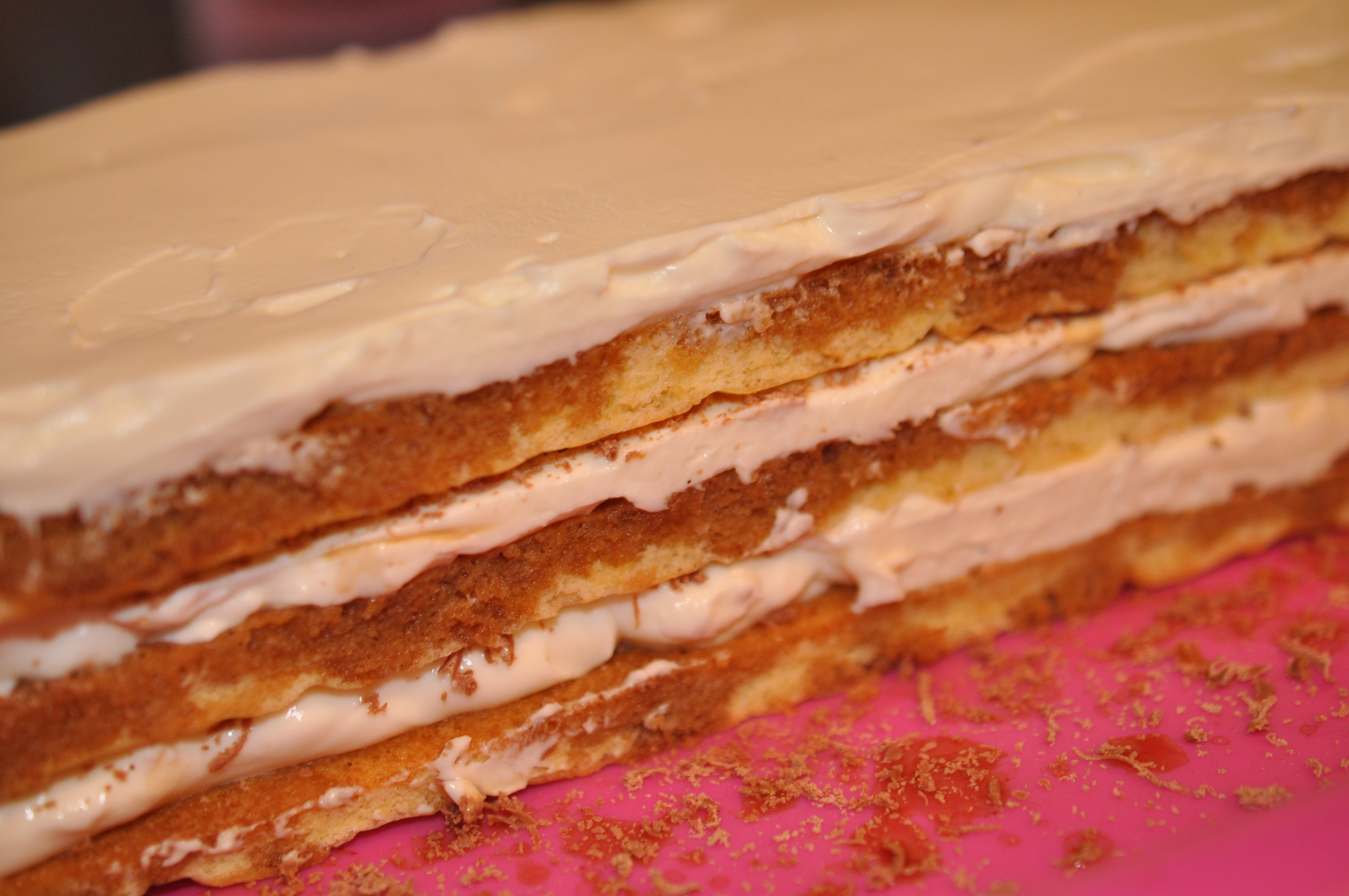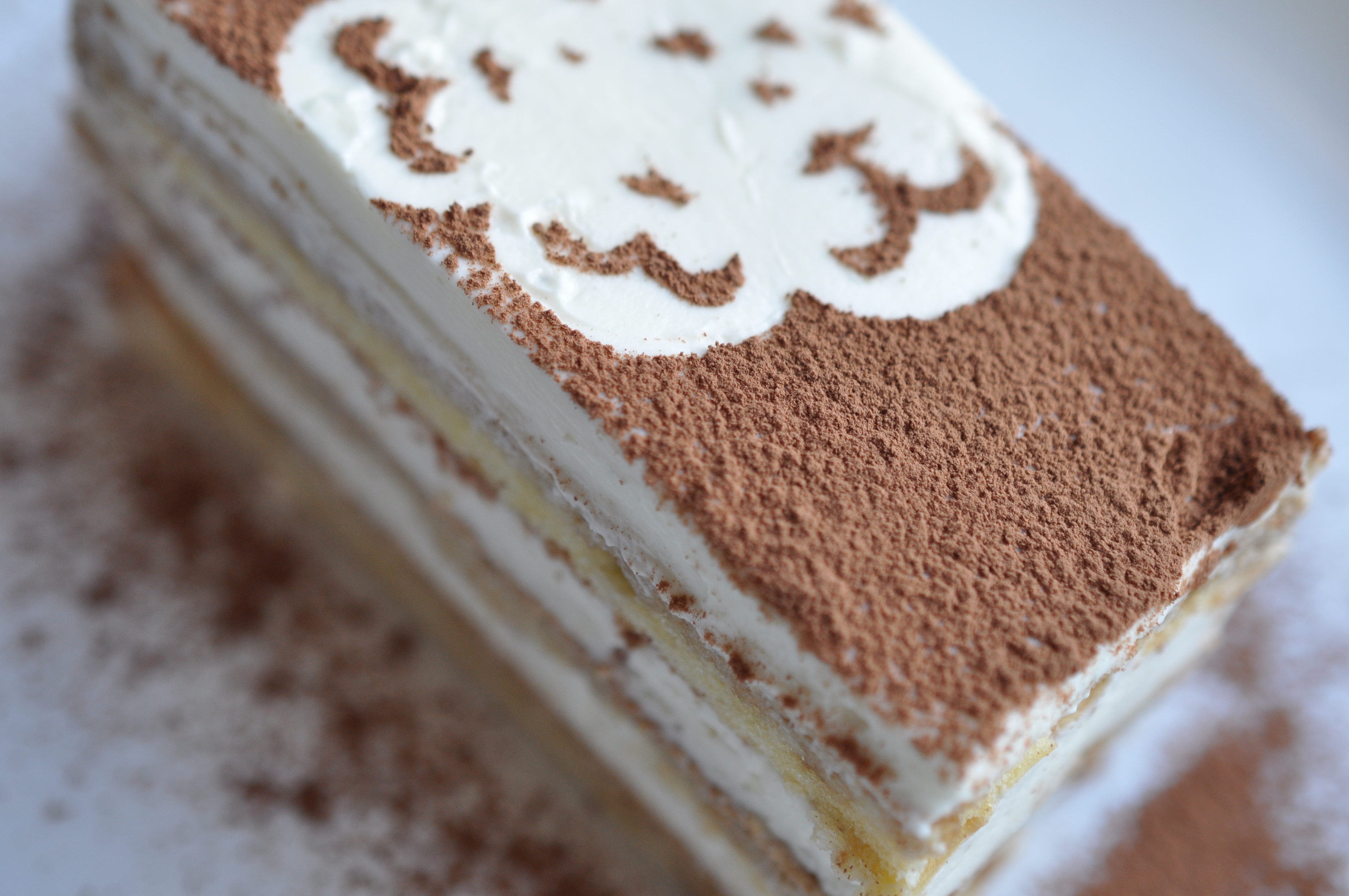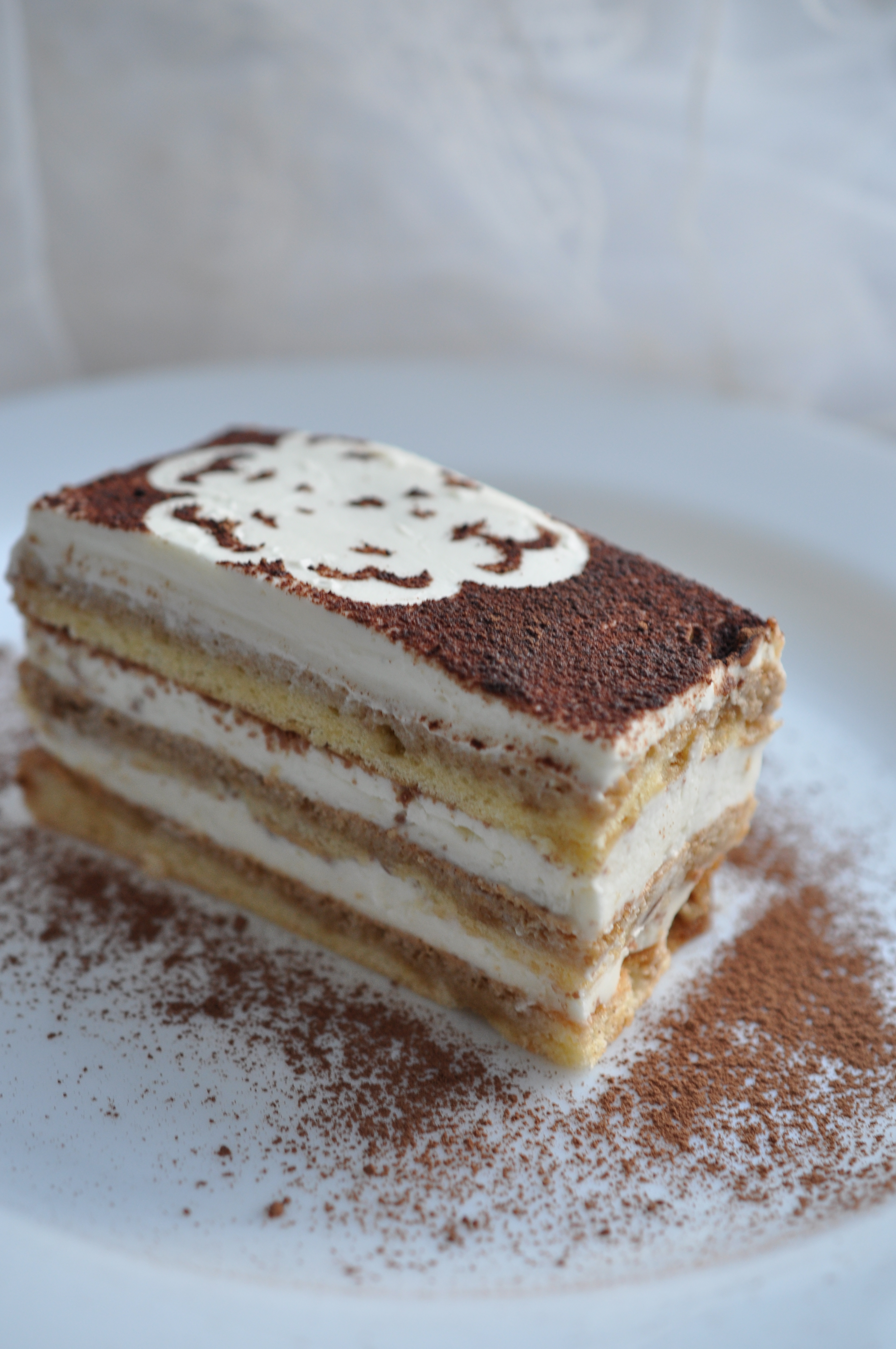 Esmu ļoti iecienījusi BBC Good Food veidoto raidījumu “The Great British Bake Off”. Tas ir šovs, kurā piedalās konditori- amatieri, tie ir cilvēki ar visdažādāko izglītību, vecumu un dzīves pieredzi, bet viņus visus vieno viena kaislība- cepšana. Tātad katrā raidījumā dalībniekiem jāpārvar trīs pārbaudījumi. Pirmais pārbaudījums ir par noteiktu tēmu, piemēram, tartes. Tad nu katrs dalībnieks var nedēļas laikā izlemt kādu tarti gatavos, mājās to pārbaudīt un attīstīt līdz perfekcijai. Bet pēc tam tā jāgatavo milzīgā studijā kopā ar citiem dalībniekiem. Ierobežots laiks, kameras un citu vērīgās acis ir papildus apgrūtinošs faktors. Nākamais pārbaudījums saistīts ar dalībnieku prasmju pārbaudi- ikvienam tiek izsniegta recepte un tad nu nekavējoties uz vietas noteiktā laikā tā ir jāpagatavo. Reizēm dalībnieki to nekad dzīvē vēl nav pat nobaudījuši, kur nu vēl pagatavojuši. Tā ka iet visādi. Trešais pārbaudījums tiek saukts par Showstopper- tātad gatavotajam ir jābūt iespaidīgam, vai tā būtu kāzu torte vai piparkūka mājiņa. Visu vērtē kompetenta žūrija. Vienā no tehniskajiem uzdevumiem dalībniekiem bija jāgatavo tiramisu kūka. Man gan droši vien nekad nepietiktu dūša piedalīties šādā konkursā, taču kopš redzēju šo raidījumu nespēju pārstāt domāt par šo kūku. Un te nu tā ir- manā izpildījumā:Sastāvdaļas: