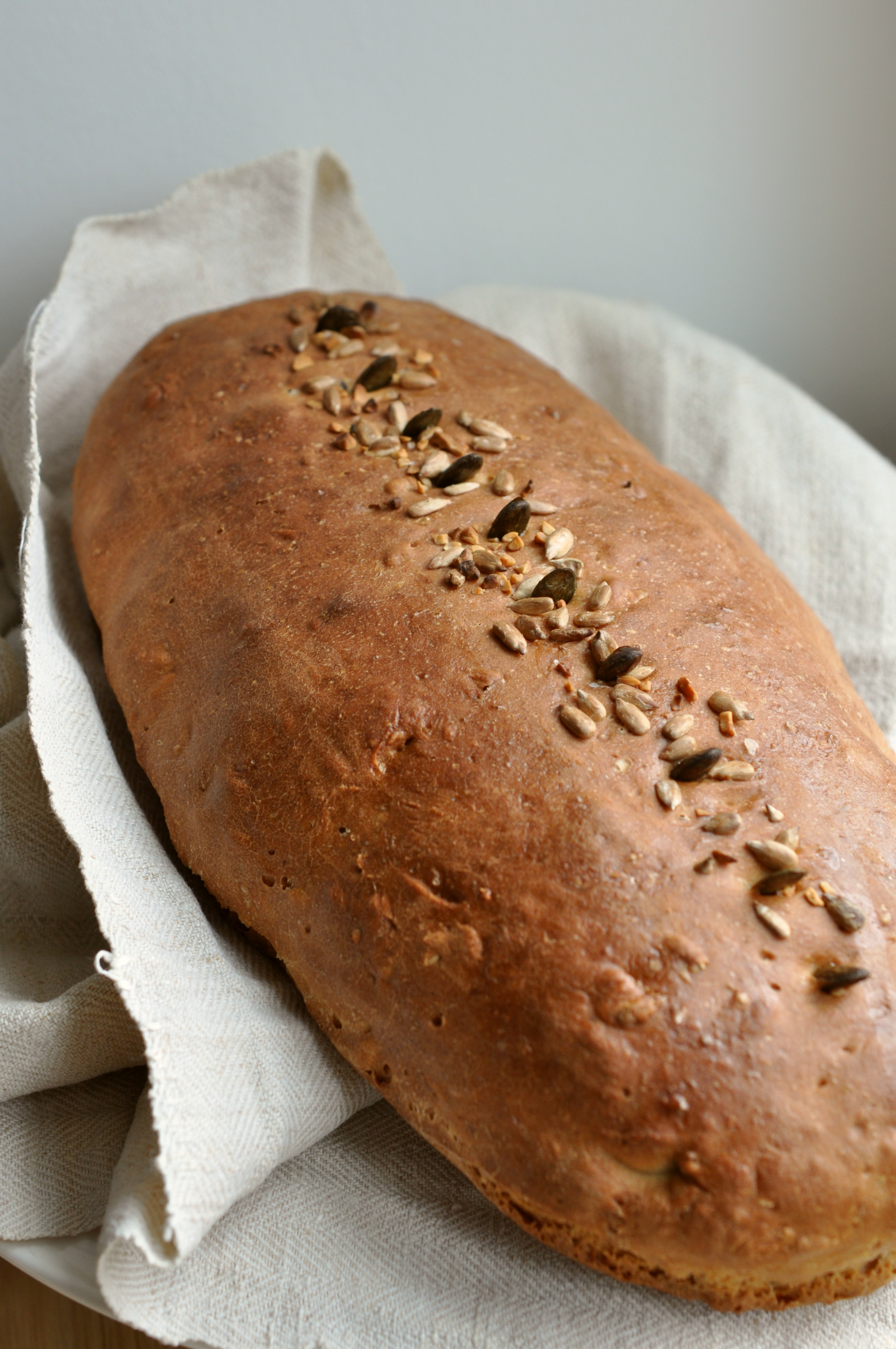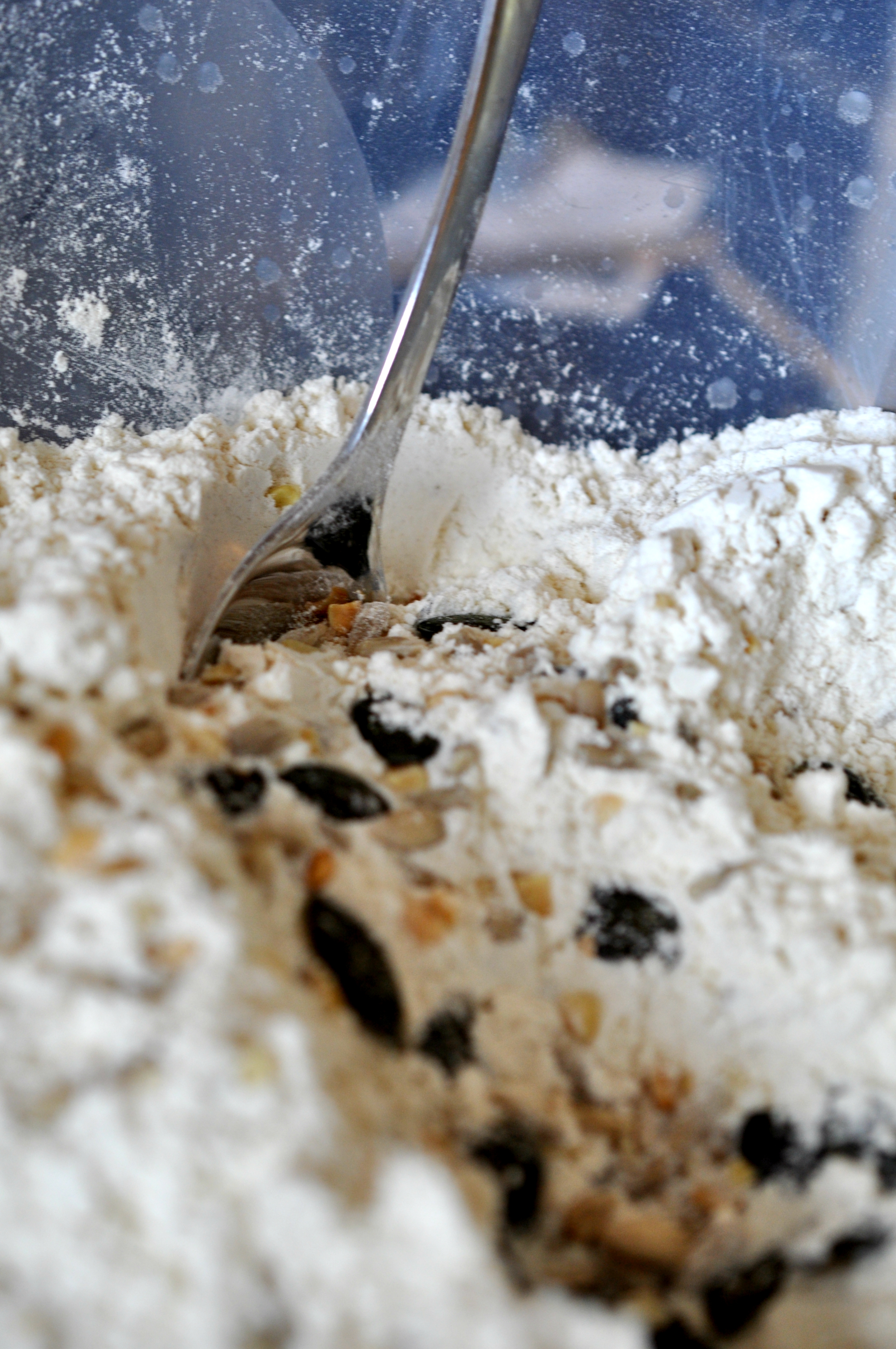 Miltiem pievienojam dažādas sēkliņas( es lietoju aptuveni 50-70 gramus). Un tad sajaucam kopā ar ieraugu un atlikušo ūdens daudzumu. Visu samīcam aptuveni 3-4 minūtes un liekam raudzēties siltā vietā 20 minūtes.