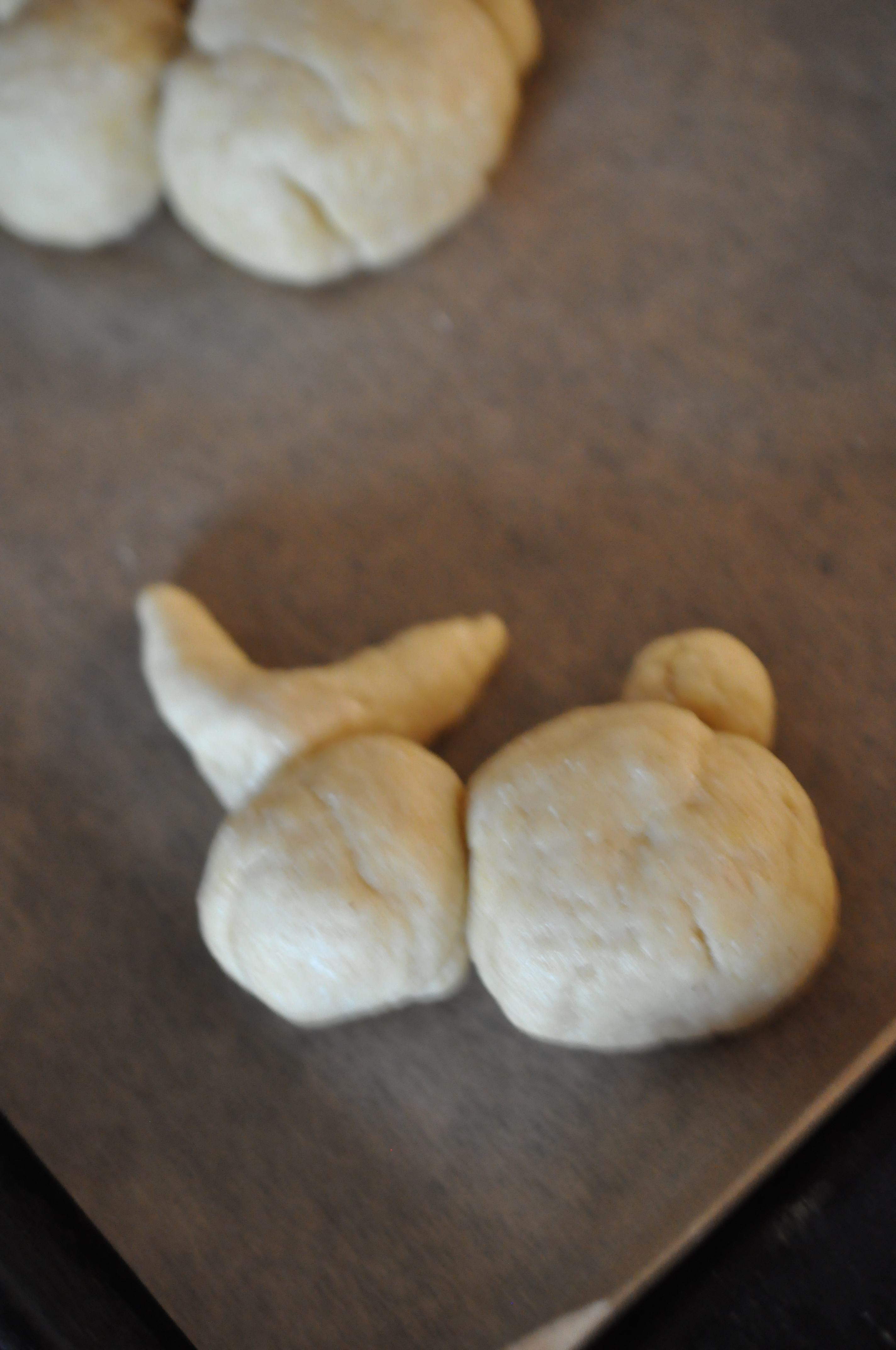 Mīklu sadala sešās daļās. No katras daļas veido vienu lielāku bumbu zaķīša vēderam, vienu mazāku, galvai, desiņu, kuru salokam kā burt V- austiņām, un pavisam mazu ļipiņu. Visas daļas pirms savienošanas pavisam nedaudz saslapina ar ūdeni, lai tās labāk turētos kopā. Acu vietā varat iespraust mandeli, uz astes un ausīm uzbērt sezama sēkliņas vai jūras sāli. Tātad kopumā jāizveido seši zaķīši. Ja veidojat saldos zaķīšus, tos var rotāt ar cukura graudiņiem. Zaķīšus apsmērē ar sakultu olu un cep 180 grādos aptuveni 25 minūtes.