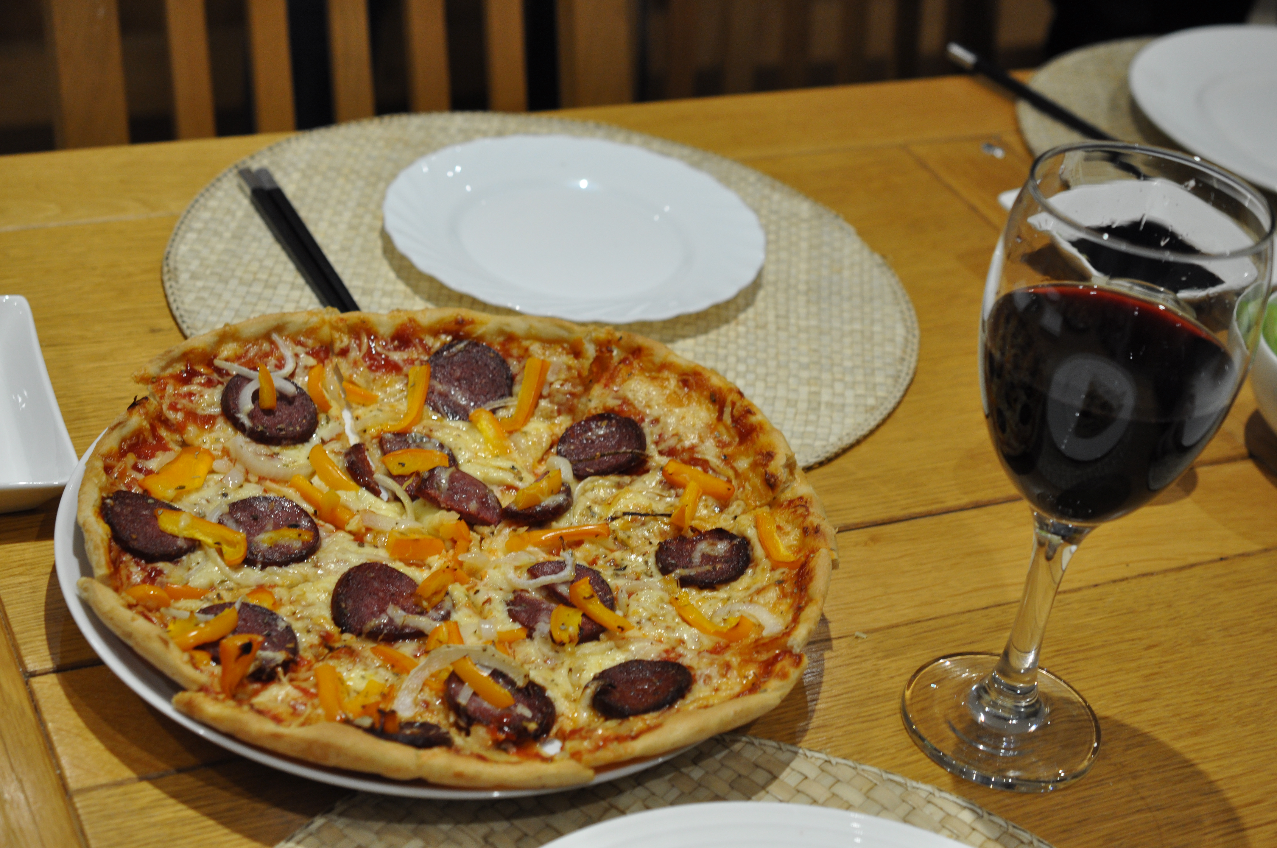 Pienu sajauc ar ūdeni un uzsilda līdz tas kļuvis maigi silts. Iejauc sauso raugu. Pievieno pārējās sastāvdaļas. Mīklu mīca līdz tā kļūst viendabīga un spīdīga. Mīcot mīklu, to ik pa laikam izveido garā desiņā, kuru saveļ kā gliemezīti un izveido bumbiņu. Liek raudzēties siltā vietā aptuveni 40-45 minūtes. No mīklas izveido 2 plānas picas. Tad es uz tām klāju tomātu mērcīti vai kečupu, rīvētu sieru un desiņu (priekšroku dodu brieža gaļas izsrādājumiem). Papildinu ar marinētiem gurķīšiem, sēnēm, paprikas gabaliņiem un sīpolu ripiņām. Kā garšvielas tradicionāli izmantoju origāno jeb raudeni, nedaudz sāli un piparus.