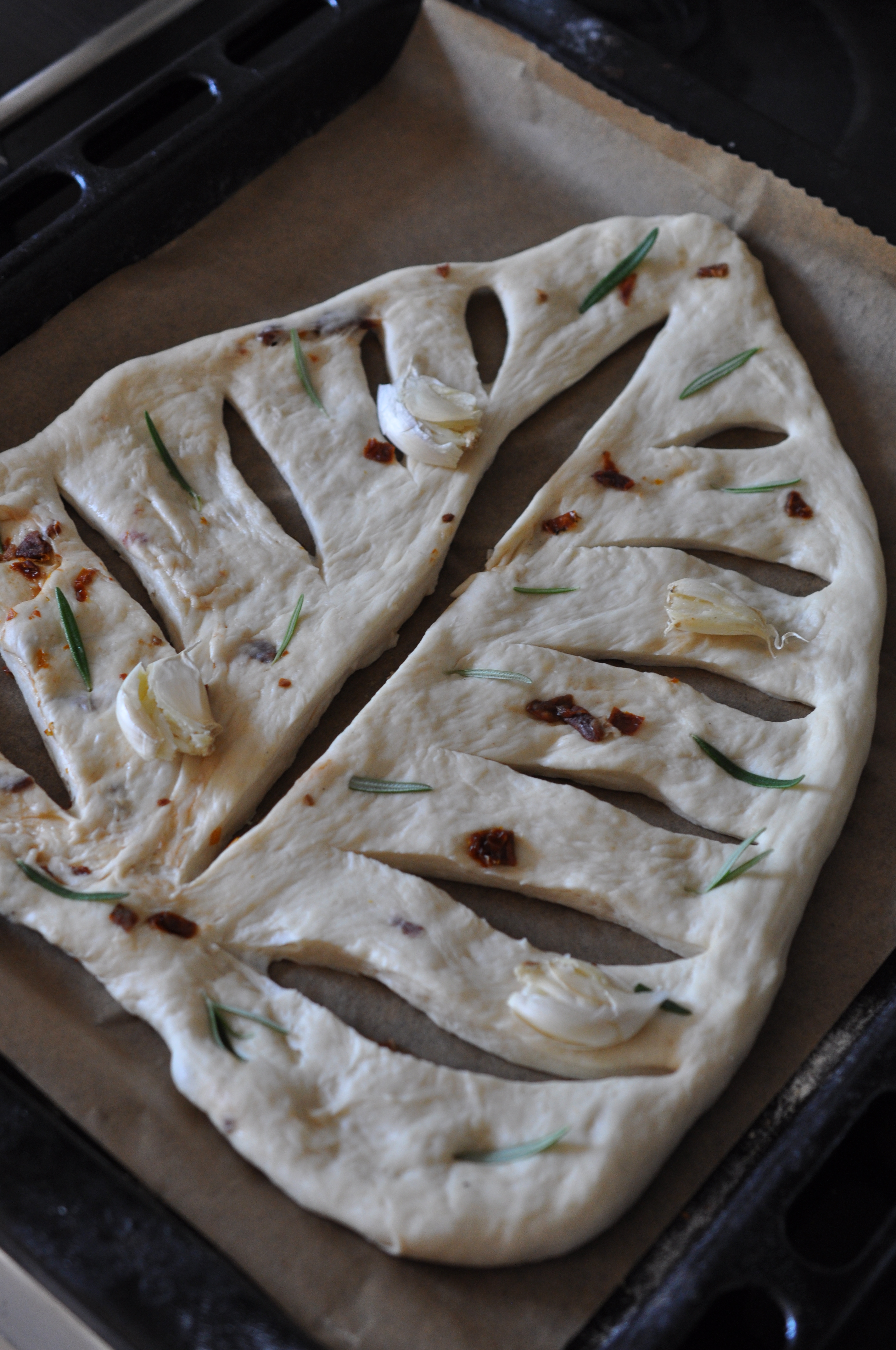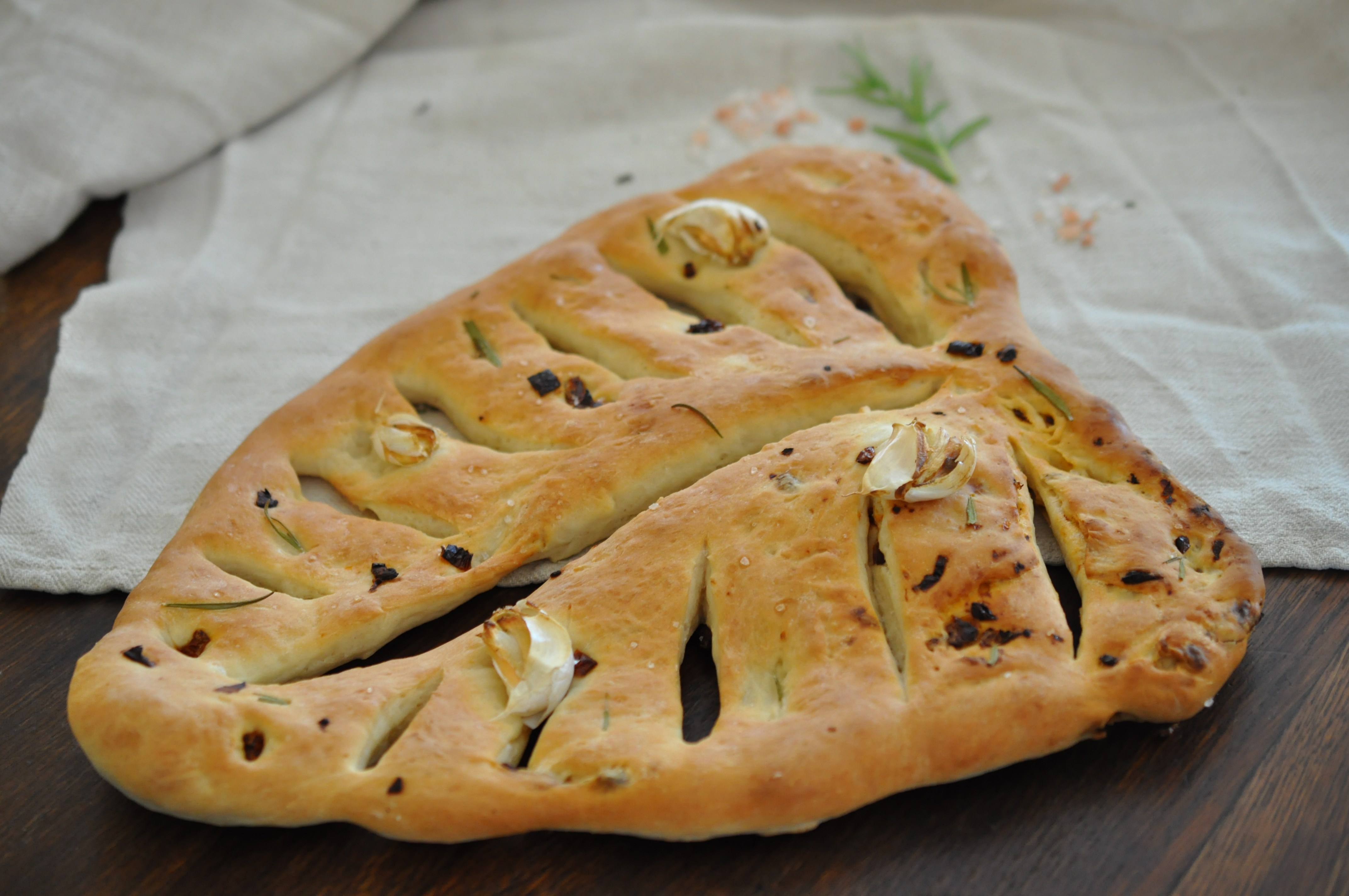 Šī ir maize, kas ir piemērota kā piedeva grillētiem ēdieniem vai vienkārši, lai dažādotu ikdienas ēdienreizes. Ārpusē maizes plācenis ir kraukšķīgs, bet vidū mīksts un porains. Es to papildināju ar tomātiem, rozmarīnu un ķiploku. Fougasse tradicionāli cep lapas formā.