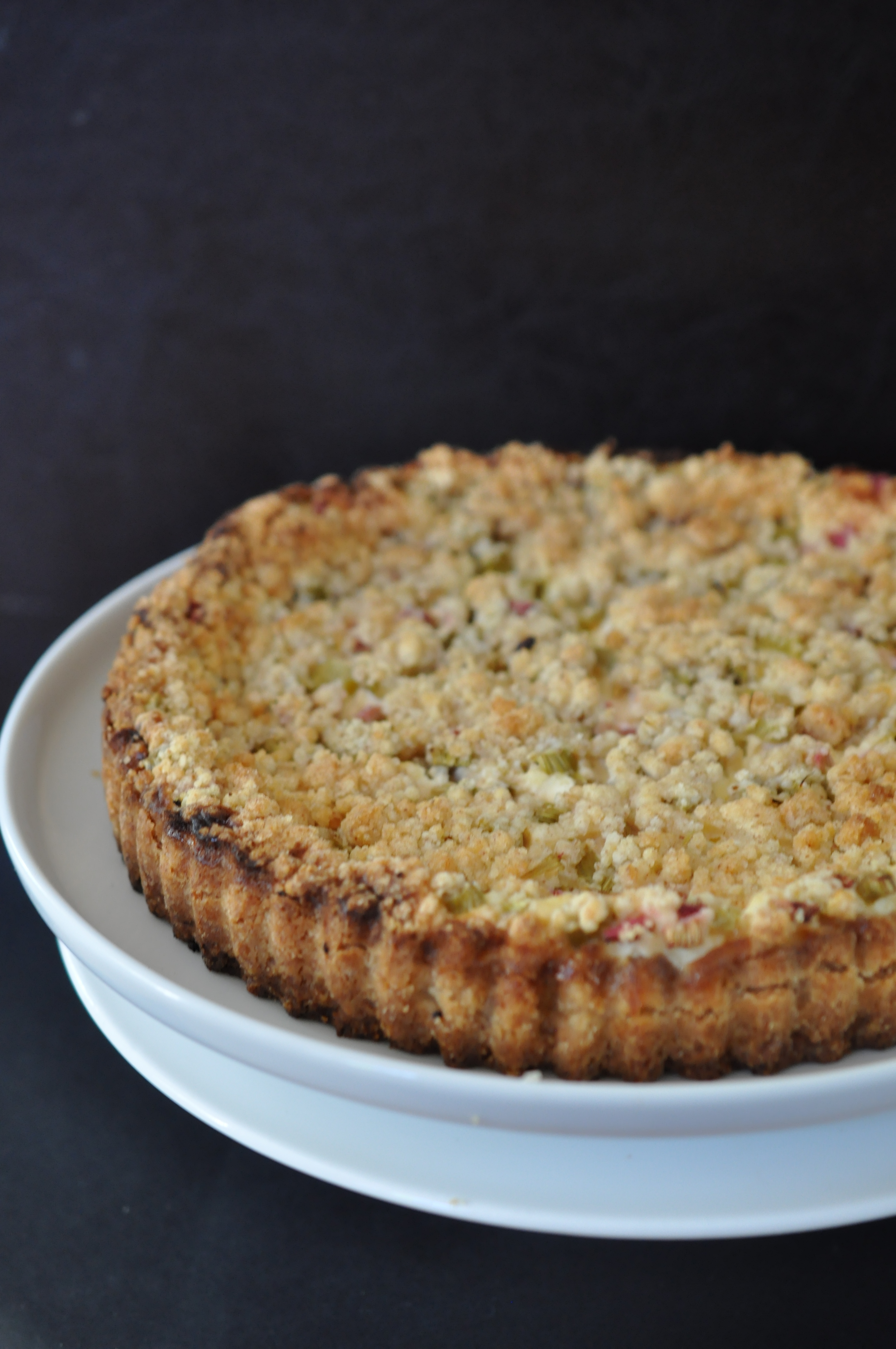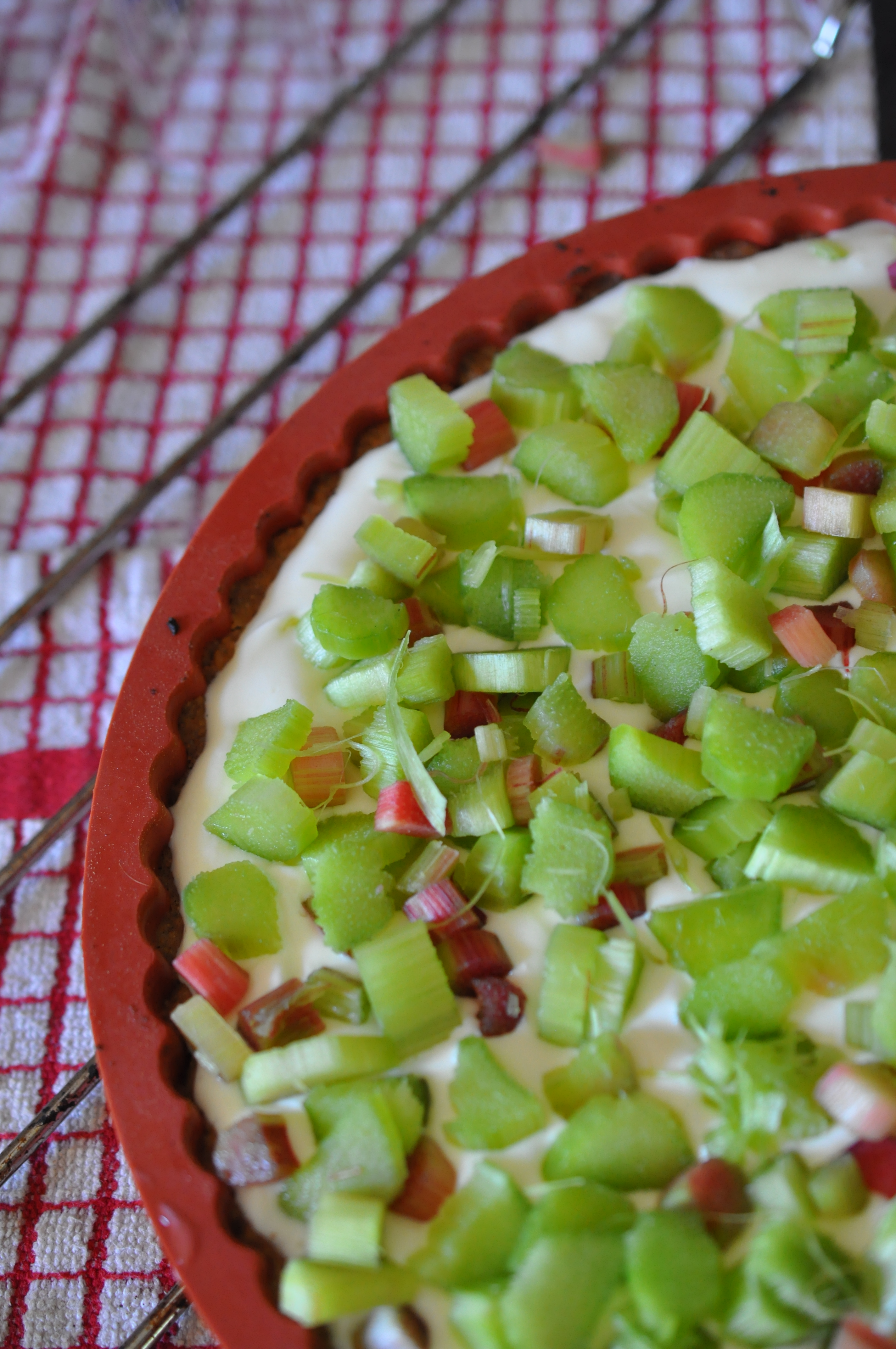 Tad veido pildījumu. Sakuļ olas ar saldo krējumu un cukuru, tā lai izveidotos viendabīga masa. Pievieno citrona miziņu, cepamo pulveri, kartupeļu cieti un maskarponi. Rabarberus notīra un sagriež mazās ripiņās un uzber pildījumam. Tad atlikušo mīklas trešdaļu sadrupina mazās drupačās, ja nepieciešams, pievieno vēl 2-4 ēdamkarotes miltu. Drupačas pārber kūkai. To cep 190 grādos 45 minūtes.