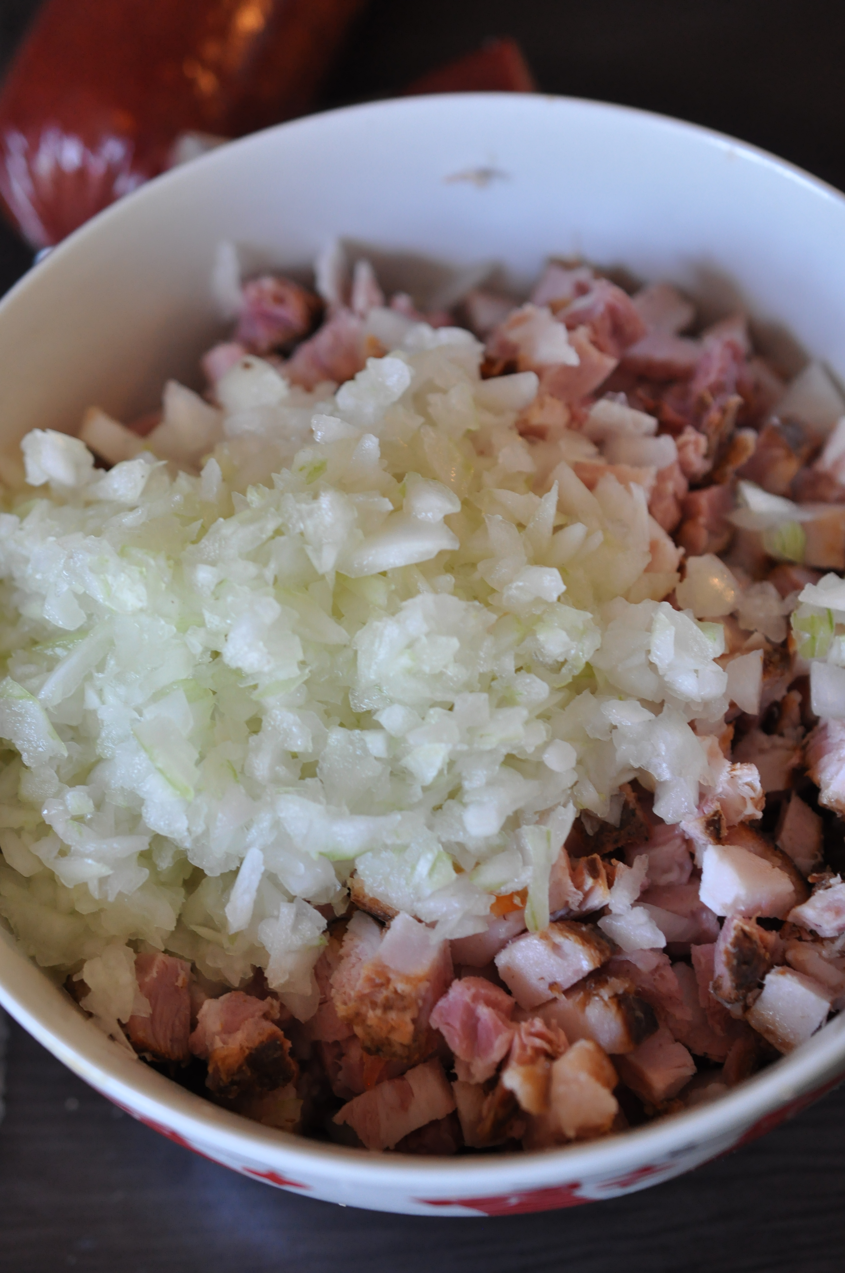 Liekam rūgt mīklu siltā vietā aptuveni 1 stundu. Tā laikā smalki sagriež cūkgaļu un sīpolu.
