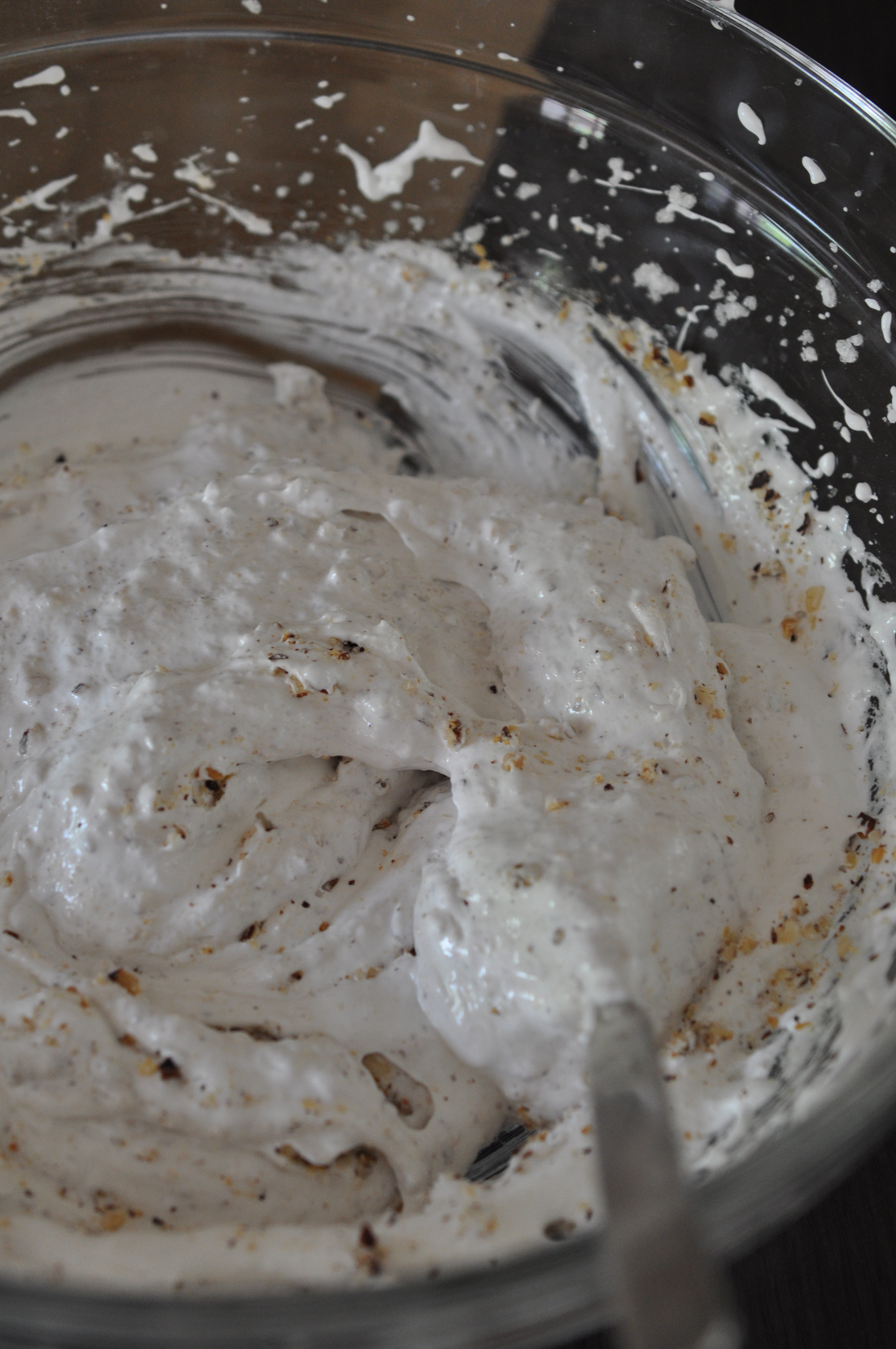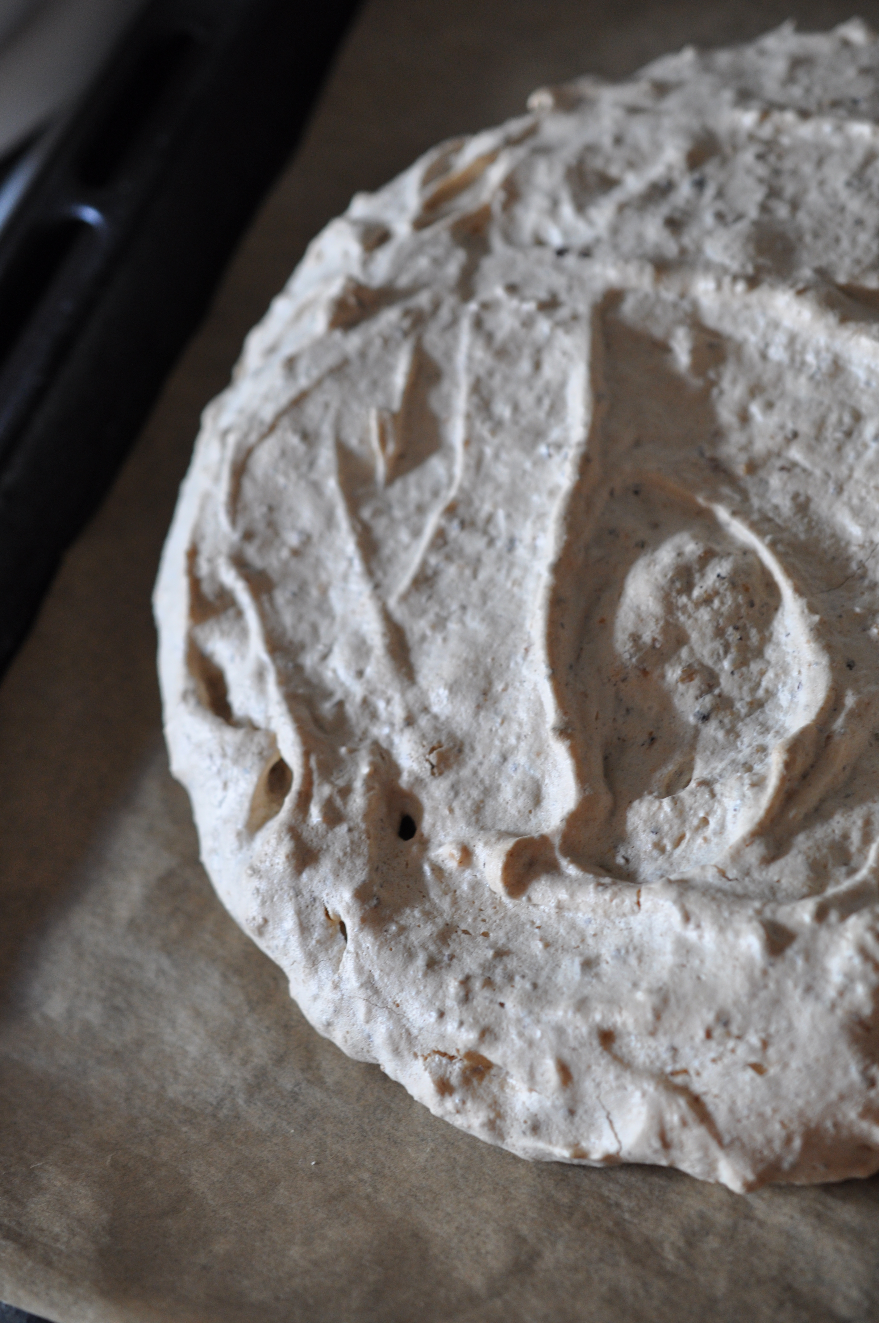 olbaltums cielaviņaiEs katru biskvītu cepu atsevišķi, tādēļ minētās bezē sastāvdaļas sadalīju uz divi (katrai ripai 3 olas baltumi). Riekstus sasmalcina un liek apbrūnināties pannā uz kuras uzklāts cepamais papīrs. Es riekstus apbrūnināju cepeškrāsnī. Tikai esiet uzmanīgi, lai rieksti neapdeg. Tad uz cepamā papīra ar zīmuli uzzīmējiet ripu 26cm diametrā, tas palīdzēs izcept glītas ripas. Otru cepamā papīra pusi ietauko ar sviestu. Tas ir ļoti svarīgi, jo tas palīdzēs bezē pavisam vienkārši dabūt nost no cepamās virsmas. Olas baltumam piemet mazu šķipsniņu sāls un puto līdz tas ir vidēji stingrās putās, pievieno cukuru un turpina kult. Kad olbaltums ir pavisam stingrs (jākuļ ilgi, kopumā līdz pat 10 minūtēm, tikai tad bezē saglabās savu formu), tajā maigi iecilā grauzdētos riekstus un kartupeļu cieti. Uzmanīgi bezē masu klāj uz uzzīmētā apļa un cep 150 grādos 15 minūtes, tad karstumu samazina līdz 100 grādiem, un cep 1stundu. Tad karstā krāsnī bezē ripu atstāj atdzist aptuveni 4 stundas. Tad gatavo nākamo ripu.