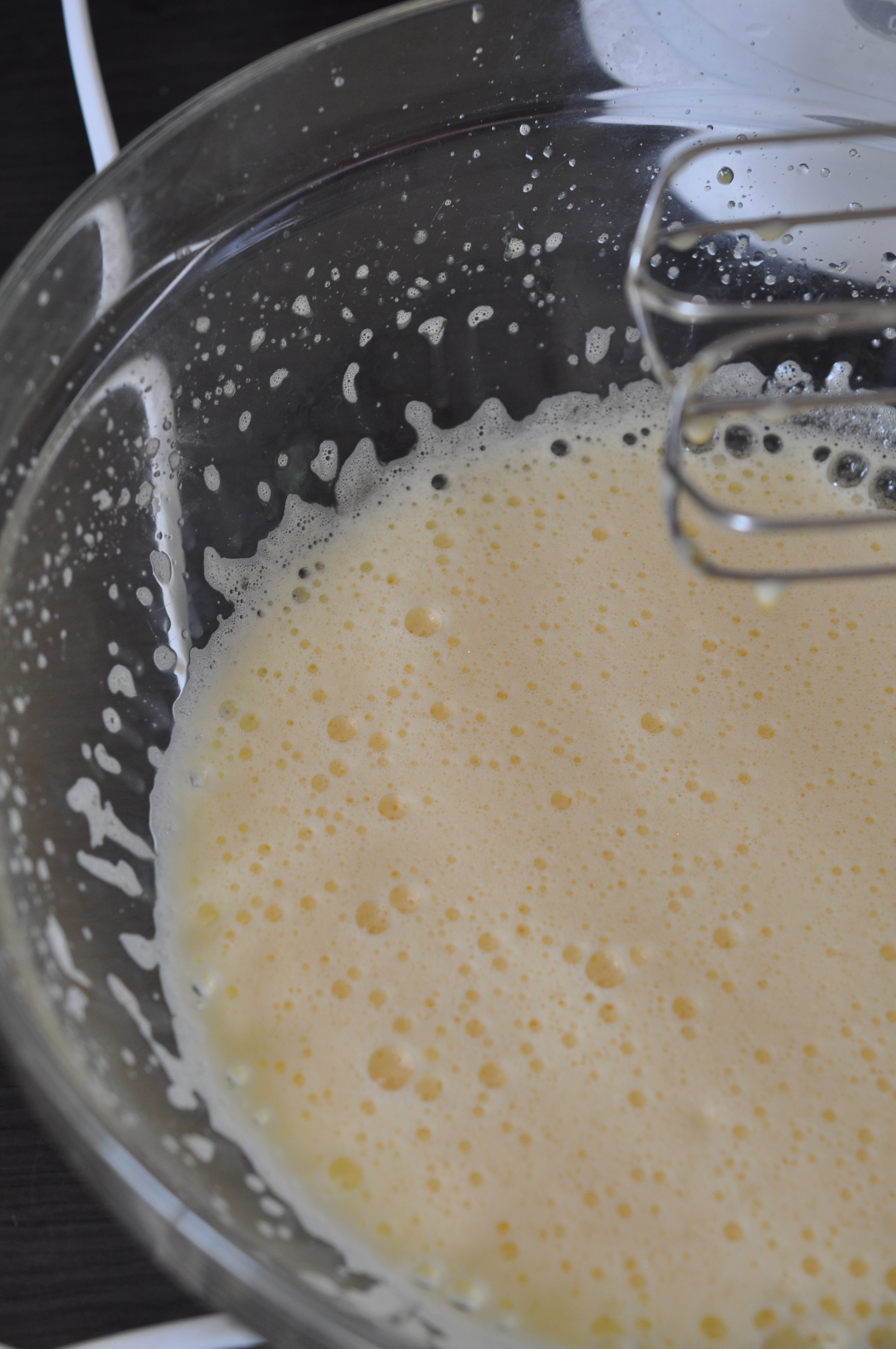riekstu bezēTikmēr pagatavo šokolādes krēmu. Bļodiņā ar mikseri sakuļ olu baltumus, noliek malā. Katliņā ieber cukuru un ielej ūdeni. Karsē līdz cukurs pilnībā izkusis, ūdens sācis vārīties. Tad karsto sīrupu ļoti tievā strūkliņā lej olas dzeltenumā, kuru puto ar lielāko ātrumu. Olas dzeltenums kļūs tumīgs un gaišs.
