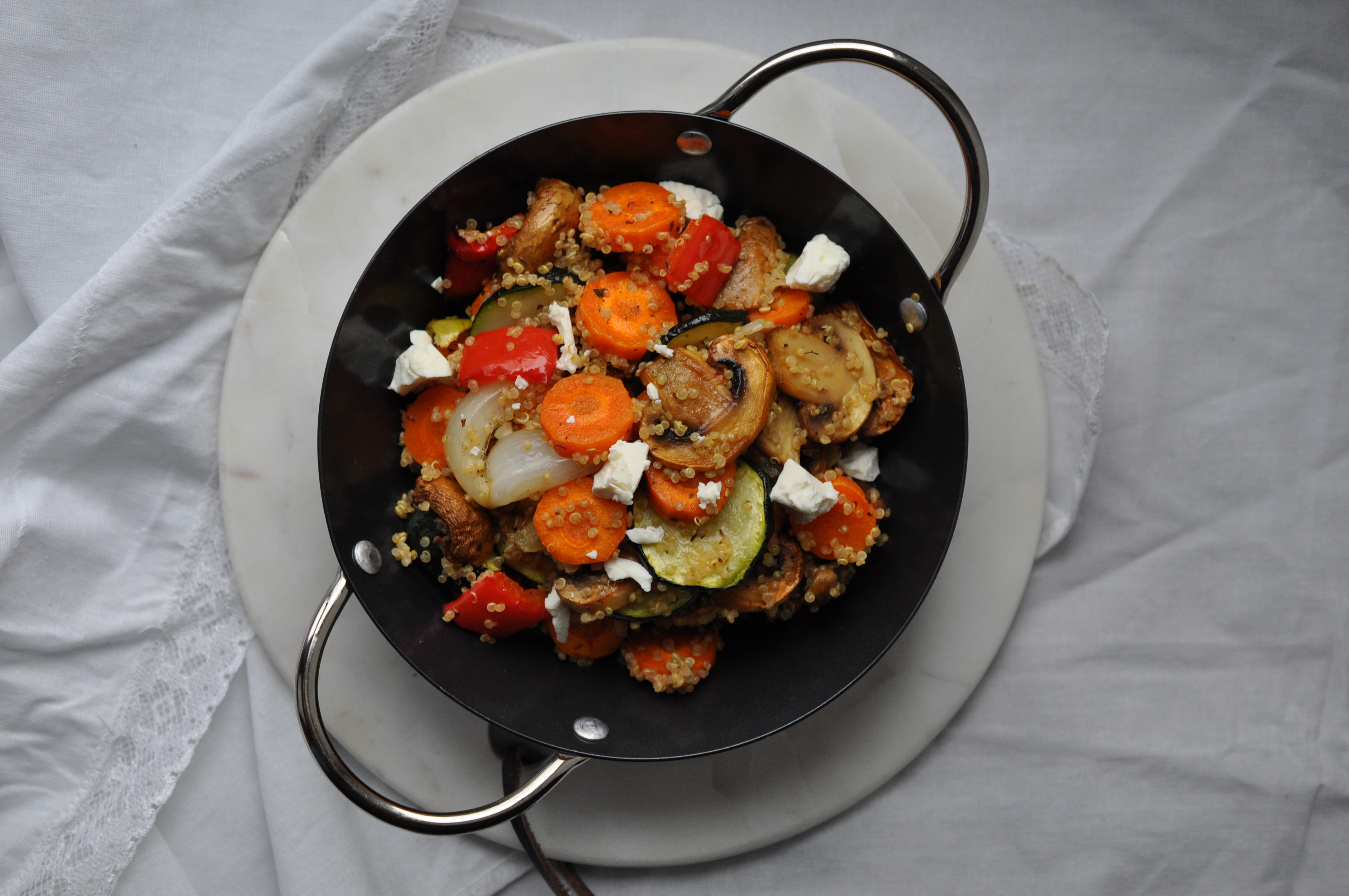Krāsnī cepti dārzeņi ar kvinoju un fetas sieru